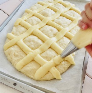 Coca de brioche con crema y piñones