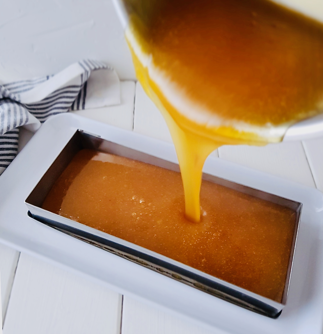 Retiramos del fuego, añadimos el zumo de limón y batimos enérgicamente para integrarlo. El limón es un excelente conservante natural. Inmediatamente vertemos en el molde y no lo tocamos para nada. Este paso tiene que ser rápido porque la mezcla empieza a gelificar enseguida.