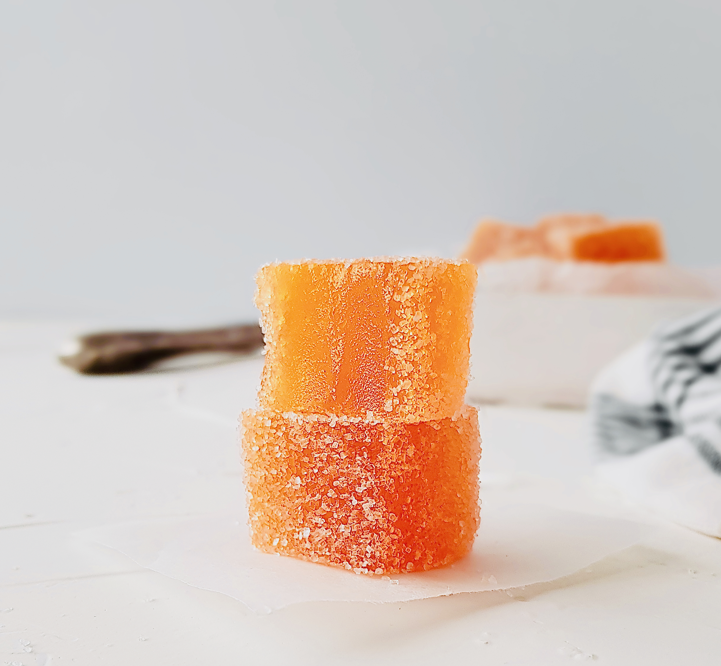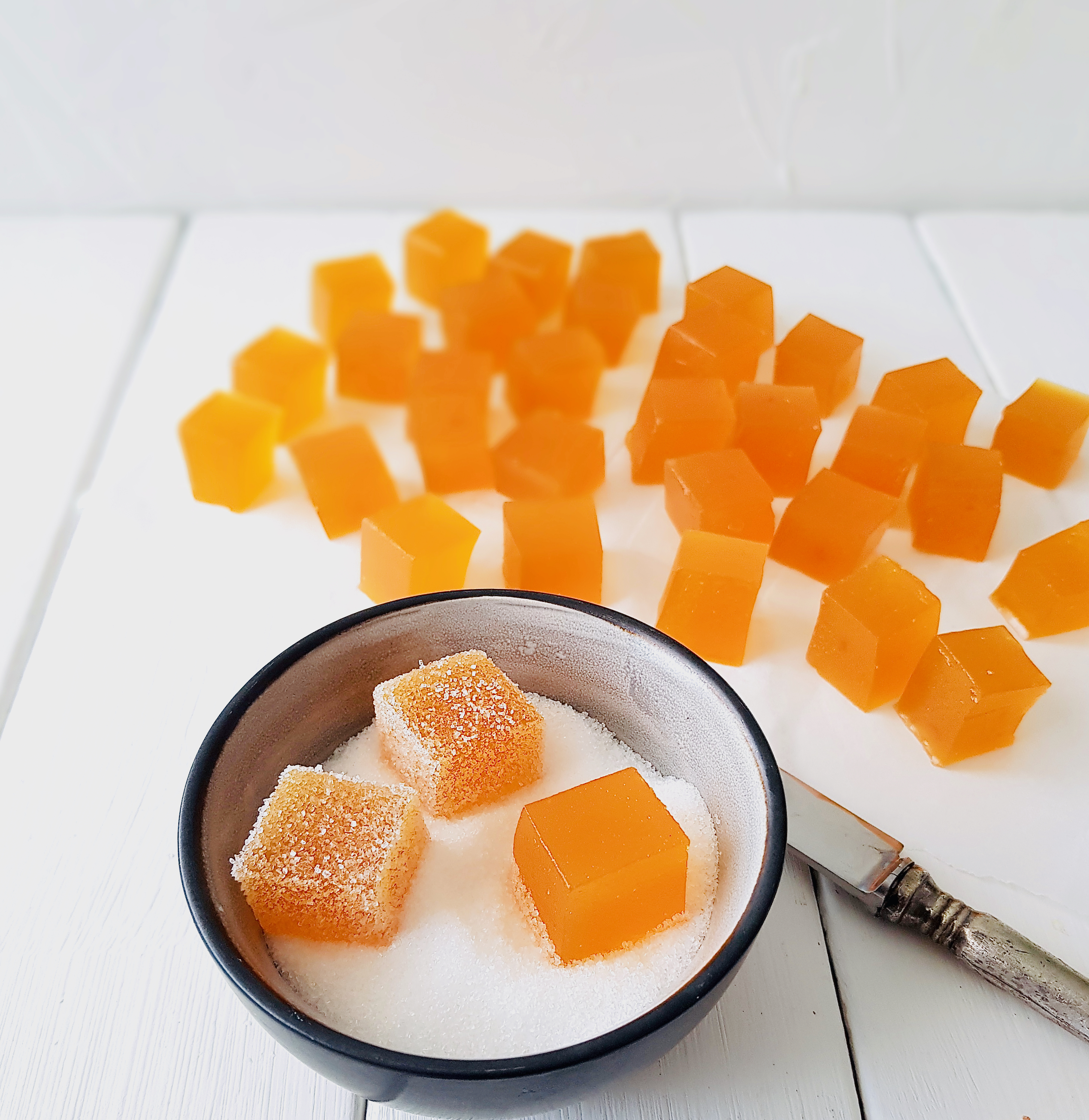 Volviendo al tema de las golominas, las que os traigo hoy están elaboradas con puré de fruta natural y pectina de manzana, entre otros. No tienen nada que ver con las que se elaboran con gelatina, que sí, que en 5 minutos las tienes hechas pero que suelen resultar gomosas y enganchosas. Con la pectina se logra una textura tierna y blandita. También vamos a utilizar jarabe de glucosa que va a aportar elasticidad. Y ya sé lo que me vais a decir, que no son ingredientes que tengamos normalmente en casa. Evidentemente yo tampoco los tengo en mi despensa, salvo cuando quiero preparar alguna cosita especial y entonces tiro de tienda online. Merece realmente la pena utilizarlos si queremos unas chuches espectaculares. Y estas os garantizo que tienen caché. Son originarias de Francia y allí les llaman Pâte de Fruit. Fijaros si son selectas que podemos encontrarlas en las confiterías al lado de los bombones. Seguro que muchos de vosotros las habéis probado alguna vez. Recibir una cajita de estos dulces es muy preciado para ellos. Contienen una buena proporción de fruta y además no llevan colorantes. Os convence ahora más? Pues venga va, que nos ponemos con ello.