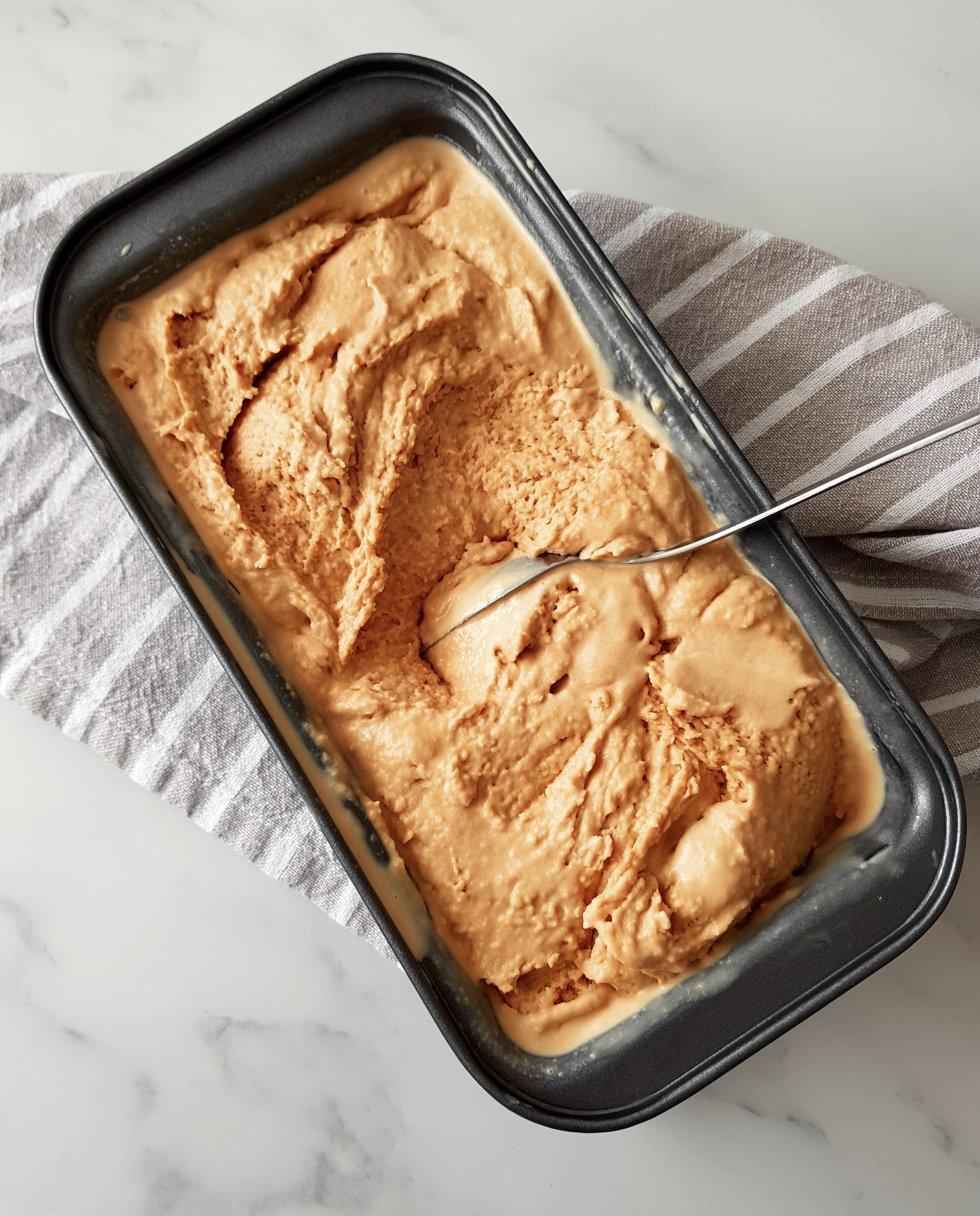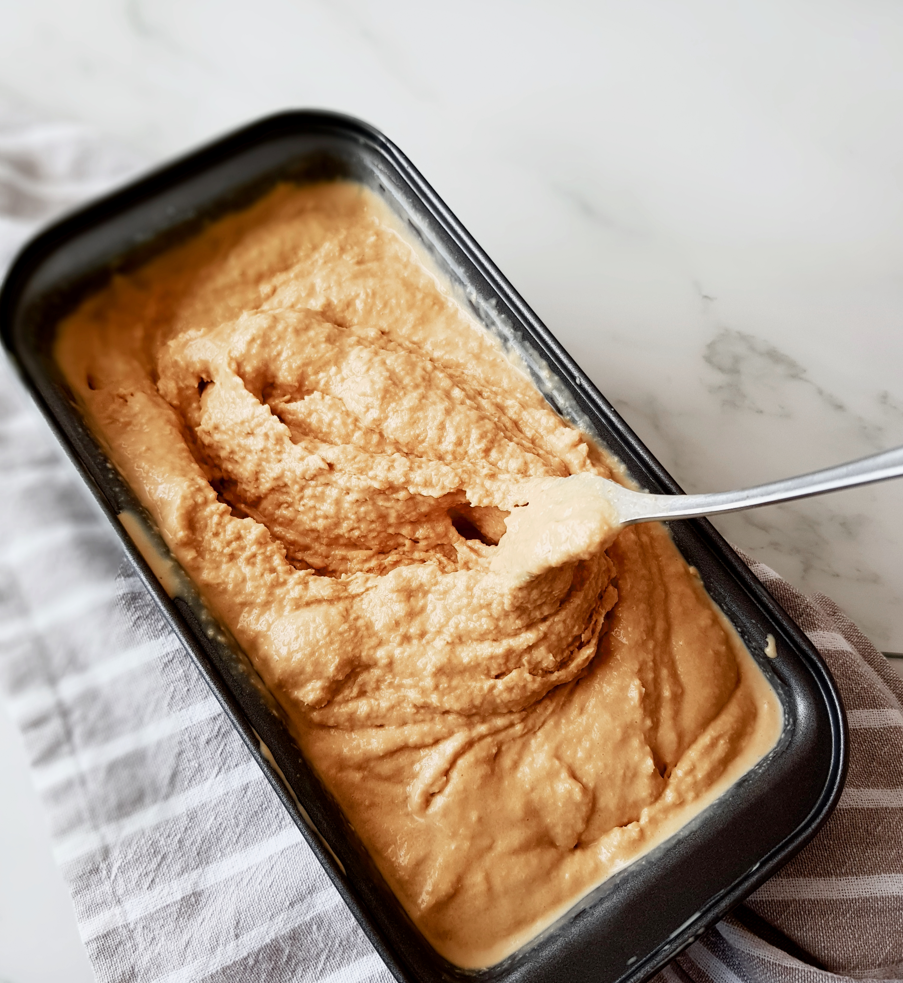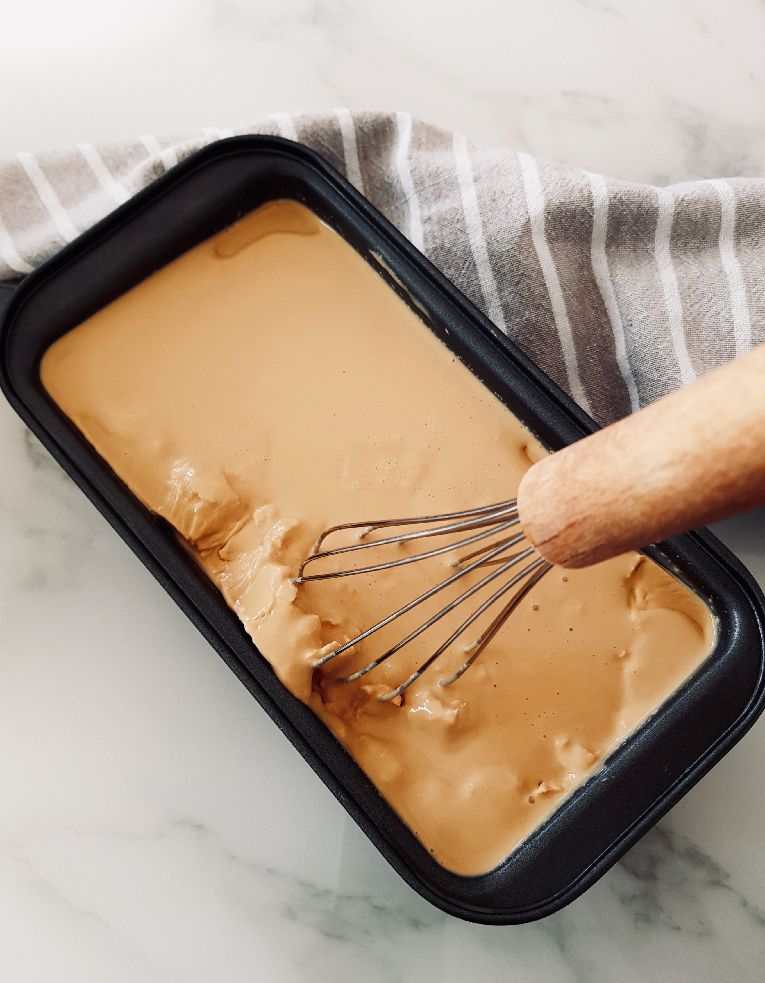 Con la mezcla bien fría comenzamos a mantecar nuestro helado. Vertemos la mezcla en un recipiente que pueda ir al congelador. Yo he utilizado un molde de plumcake porque para las cantidad preparada me viene a la medida, pero un bol o tupper que tenga altura es perfecto también. Lo introducimos en el congelador y cuando haya pasado una hora y media lo sacamos para batirlo.