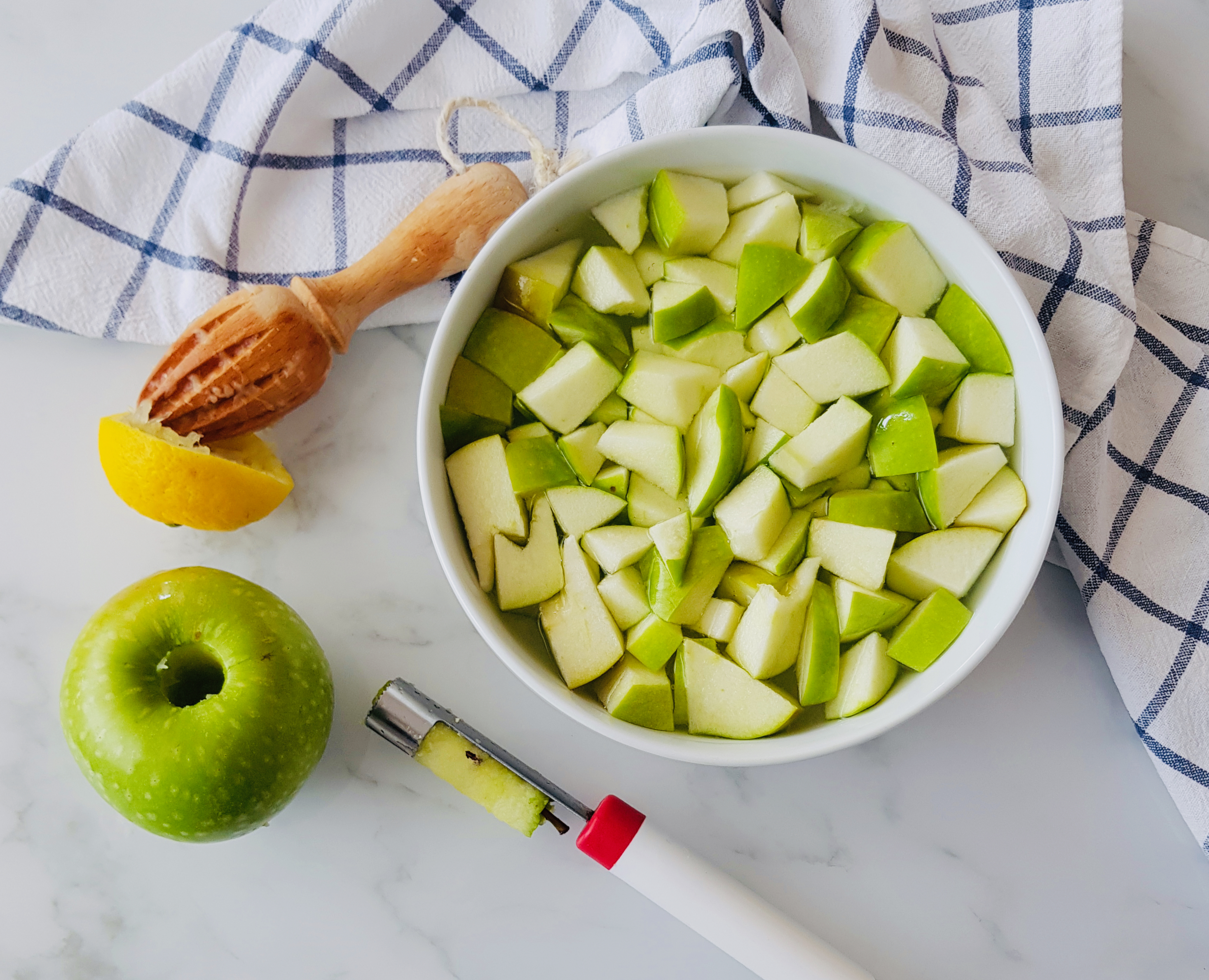Lavamos bien y descorazonamos nuestras manzanas verdes, aquellas que llaman Granny Smith. No las vamos a pelar porque de esta forma nuestros polos tendrán un color muy bonito. Mientras las cortamos podemos ir echándolas en un recipiente con agua y zumo de limón a partes iguales para evitar que se oxiden y cogan ese color amarronado que echa para atrás. Aunque si somos rápidos este paso nos lo podemos saltar.