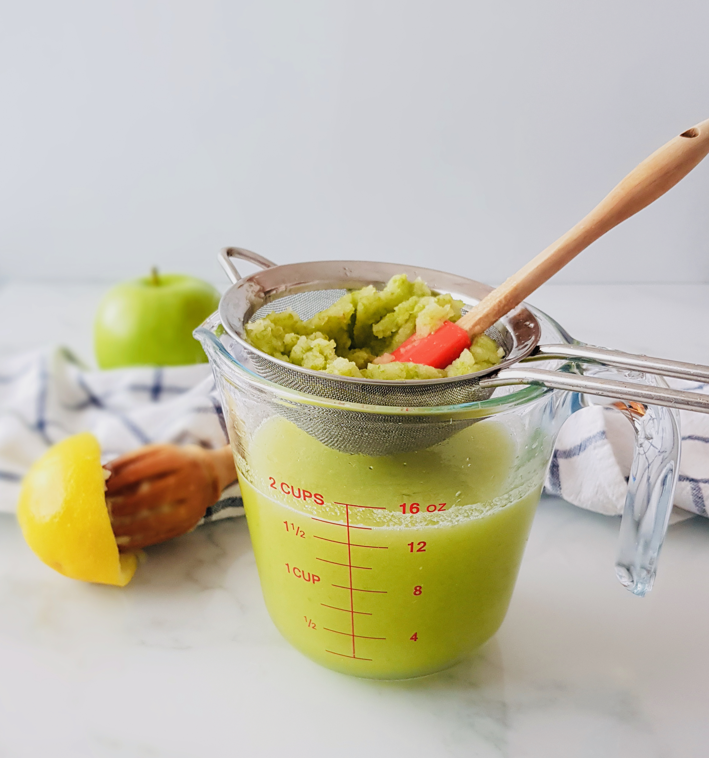 Las escurrimos y ponemos a triturar junto con el almíbar y el zumo de un limón. Si tenéis una procesadora de alimentos potente tipo Thermomix, perfecto porque lo que nos interesa es que quede una textura lo más fina posible aprovechando la piel de manzana que además de aportarle color tiene propiedades nutritivas muy interesantes. Y sino, pues con una batidora de cuchillas, la de la mayonesa de toda la vida, aunque tendréis que hacerlo en dos tandas para que se triture bien o utilizando un recipiente grande donde quepan todas holgadamente. Trituraremos hasta hacer un puré muy muy fino. Aún así hemos de pasarlo por un colador para retirar lo que no ha podido triturarse porque después no es agradable al paladar, por lo menos para mí.