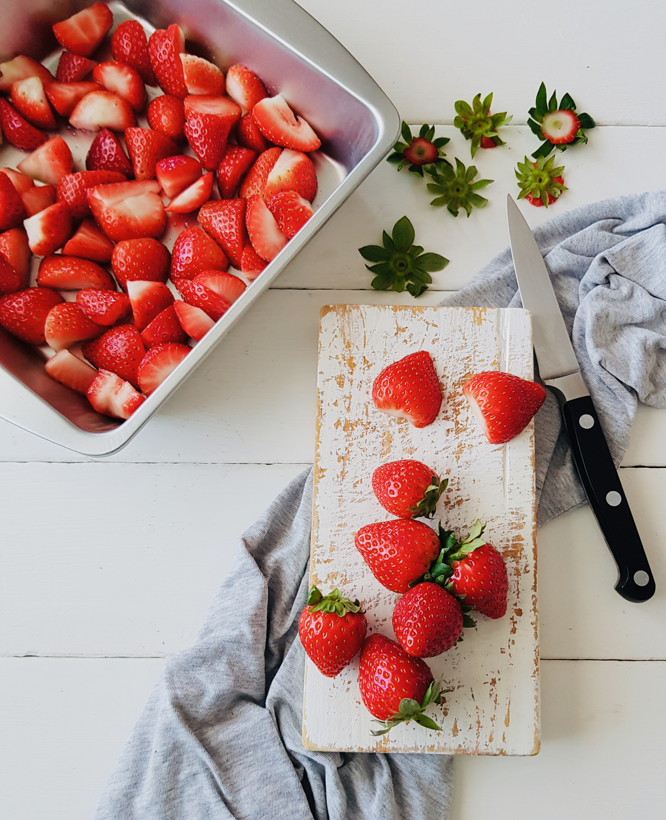 Lavamos y dejamos escurrir bien las fresas, las troceamos en pequeñito y congelamos. El mejor método para congelarlas es poner los trozos de fruta extendidos en un bandeja, llevamos al congelador y cuando hayan congelado las metemos en bolsas de uso alimentario con cierre. De esta manera no se congelarán en bloque y podremos coger la cantidad que queramos cada vez.