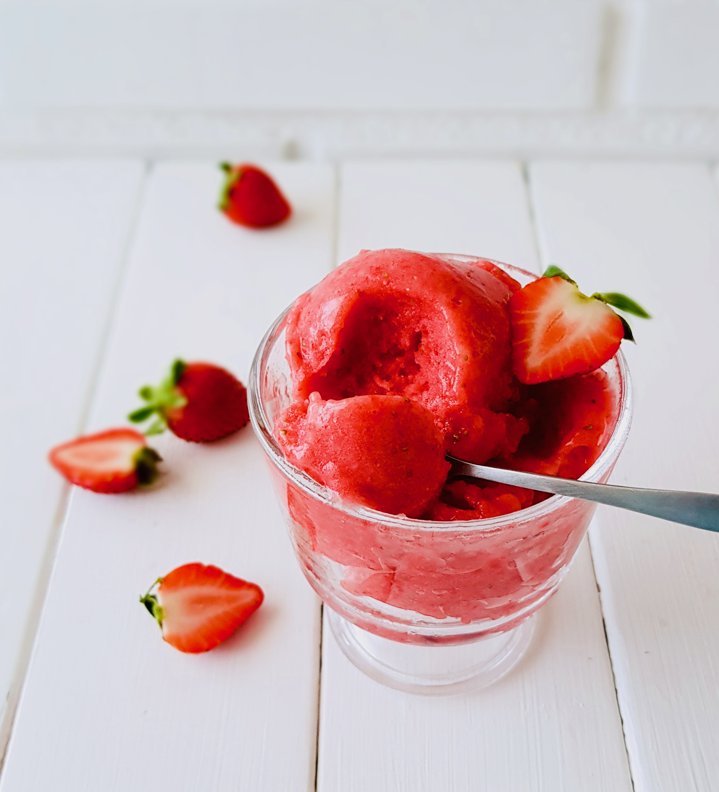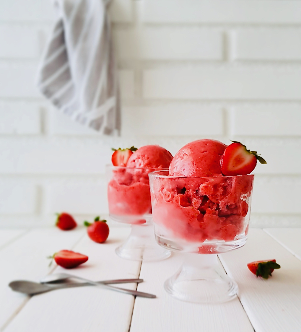 Total que como es temporada de fresas es momento aprovechar a hacer algo con ellas, pues es ahora cuando más buenas están. Así que para esas veces en las que el calor es insoportable y solo apetecen cosas frías, nada mejor que un sorbete de fresas de elaboración rápida para tomar al momento y que vais a alucinar porque se elabora con solo dos ingredientes. Que no os lo creéis? Pues seguid leyendo hasta el final, que os va a interesar. Por cierto, si no os gustan las fresas podéis utilizar otro tipo de frutas, pero ojo! no todas funcionan bien para hacer este sorbete rápido. Necesitamos frutas que no contengan muchas fibras como ocurre con el mango o que no tengan muchas semillas como sucede con las moras pues éstas son muy duras y no resultan agradables en boca. Y aunque las fresas también tienen semillitas, éstas son tan diminutas que apenas se perciben. El melocotón (sin piel) va fantástico. Os cuento como prepararlo, mirad,