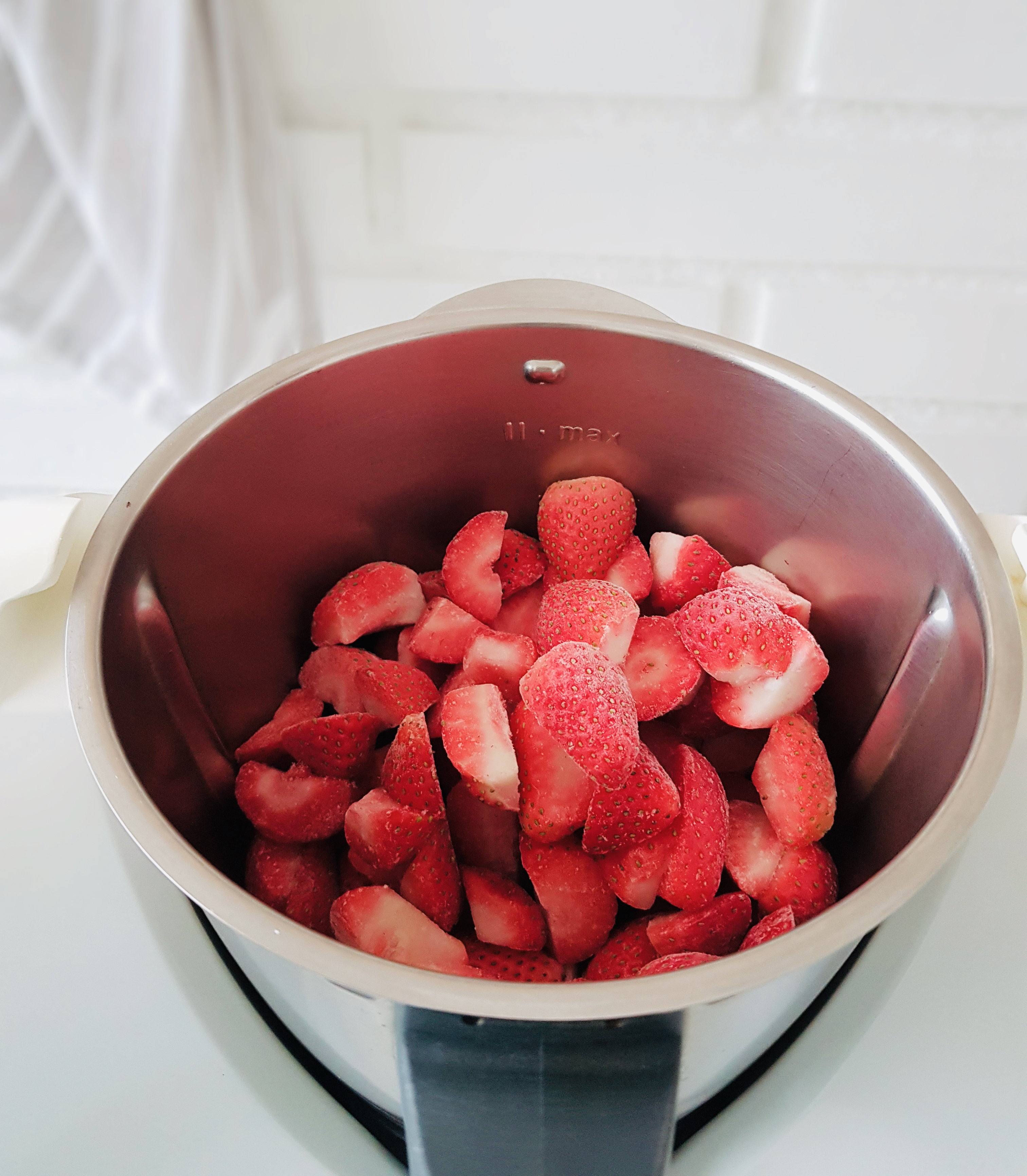 Echamos un puñado de fresas en nuestra trituradora, picadora o procesadora de alimentos. Os sugiero no llenar más que 1/3 parte o un poco más del recipiente, así tendrán espacio para triturarse. Si lo llenamos mucho es posible que se atasquen las cuchillas, a no ser que tengamos una trituradora muy potente.