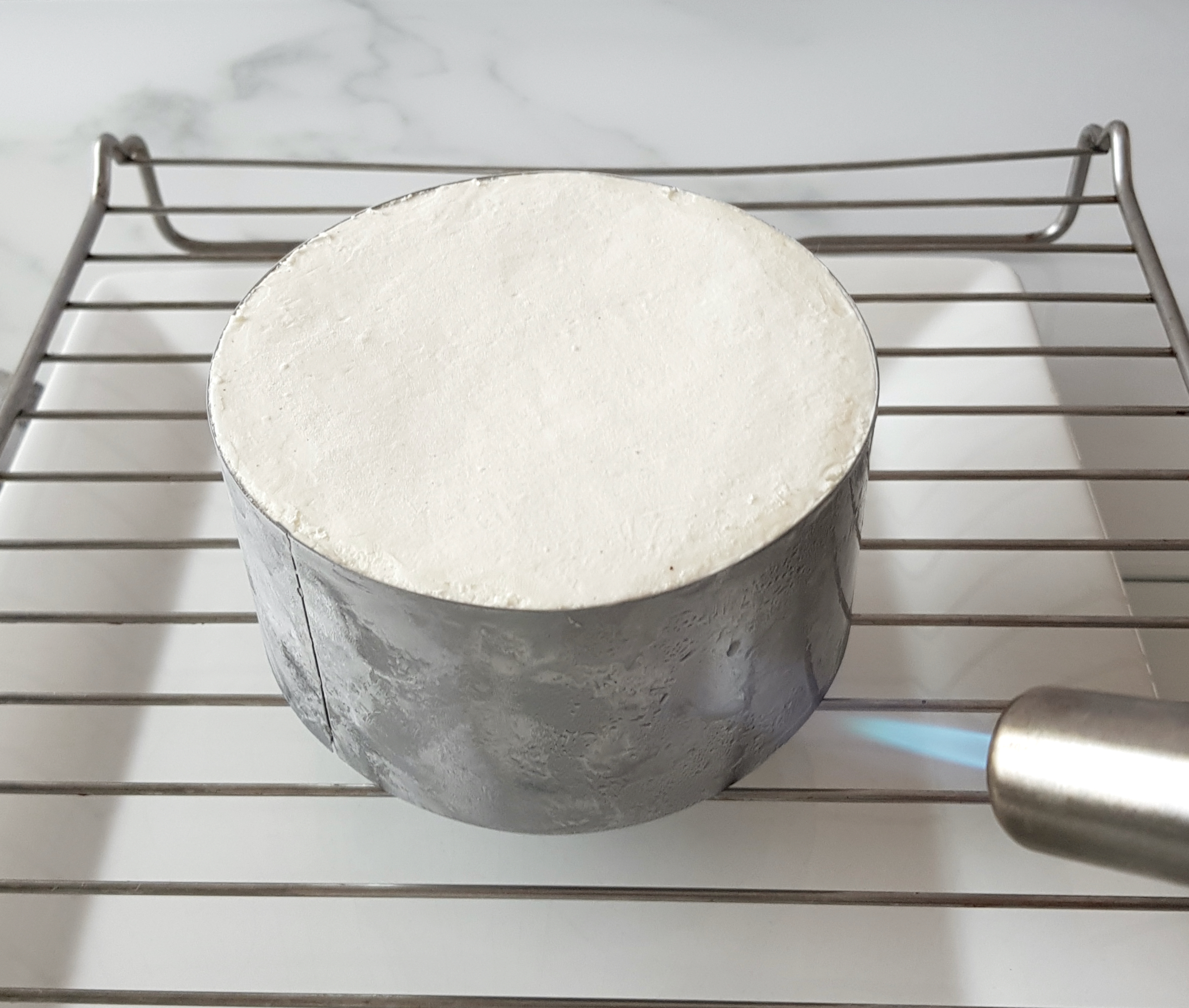 Retiramos la tarta del congelador, colocamos sobre una rejilla con un plato o bandeja debajo. Para desmoldarla, si la hemos hecho en un aro, empujamos la tarta desde abajo hacia arriba con cuidado pero con precisión y ésta saldrá sola. A continuación retiramos la tira de acetato. Si no hemos puesto esa tira como me ocurrió a mí, nos va a costar más desmoldarla pero hay un truquito muy recurrente que es calentar durante unos segundos el contorno exterior de la tarta con un soplete de cocina.