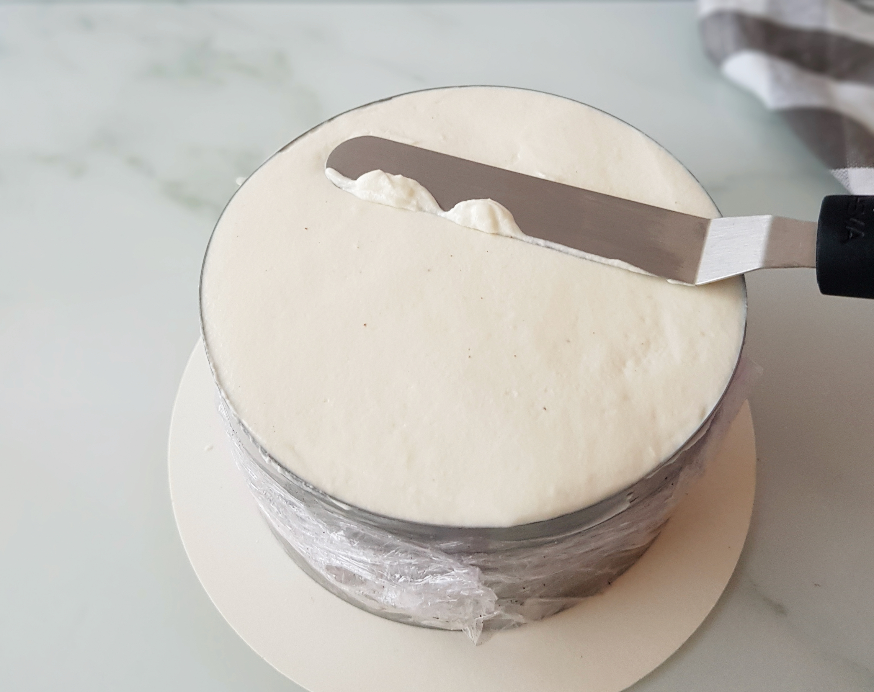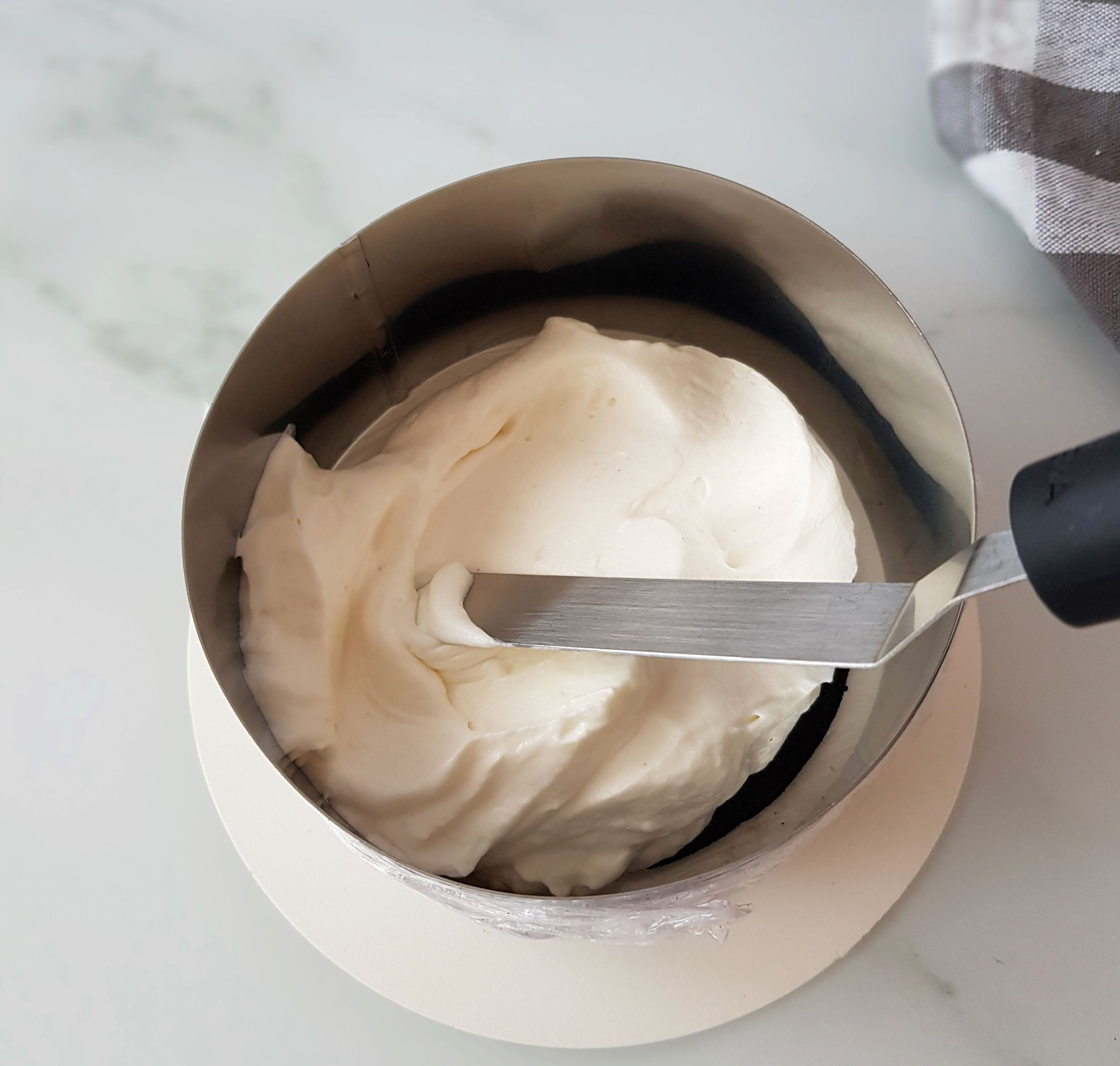 Al aro más grande también le vamos a poner film transparente en la base y colocamos sobre un plato plano o base de tarta. Nuevamente le pondremos la tira de acetato por todo el lateral interno del aro (a mí en esta ocasión se me olvidó, qué cabecita la mía….) Ponemos la galleta dentro de manera que quede centrada y quede el mismo espacio vacío por todo alrededor. Vertemos la mezcla cuidadosamente rellenando primeramente el hueco y después llenamos hasta el borde.