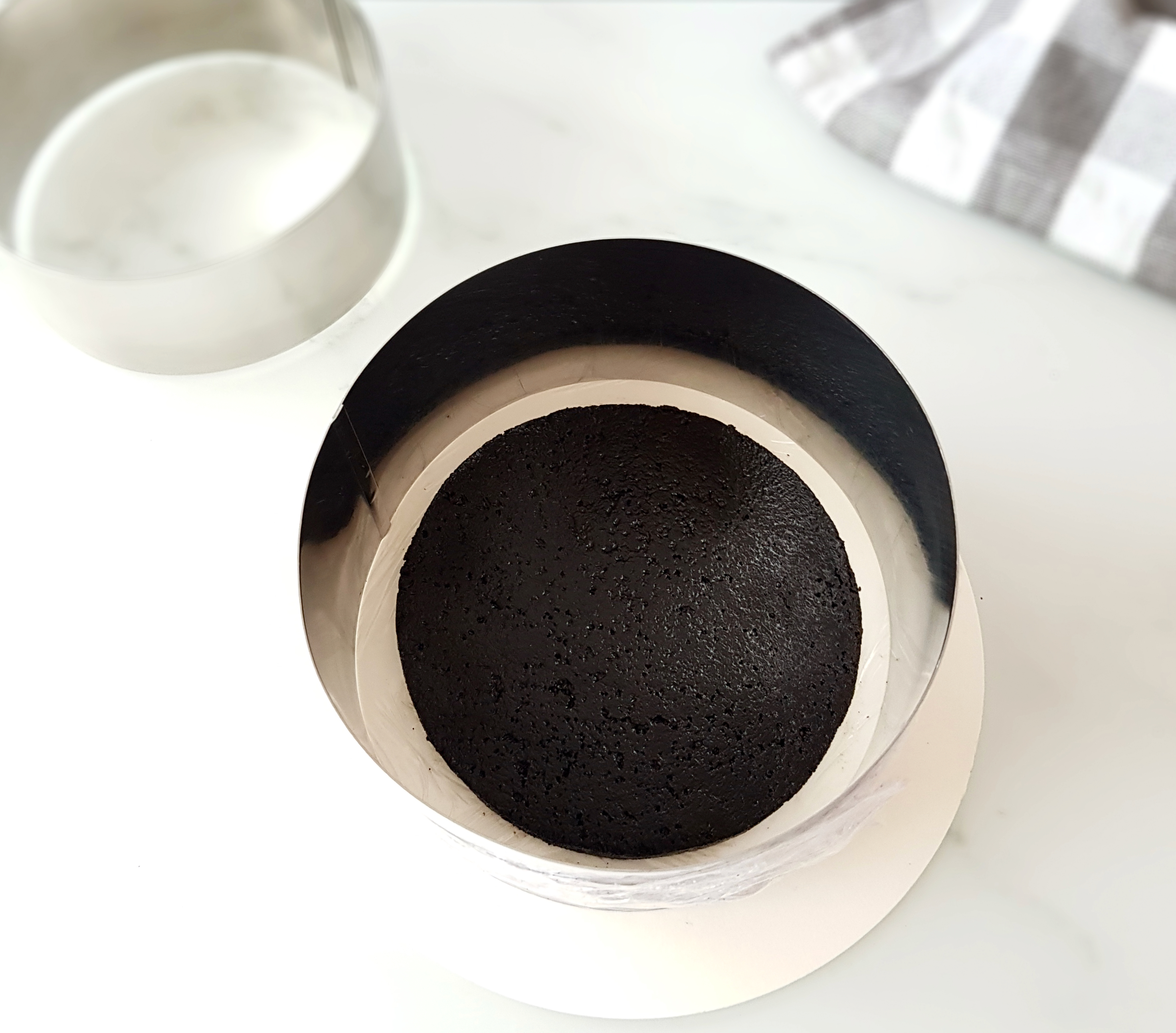 Antes de nada, comentaros que la razón de utilizar dos aros de distintos tamaños es porque a la hora de cubrirla con el glaseado va a quedar más uniforme y os cuento: la base tiene distinta textura que el relleno, es como más rugosa, por tanto interesa que quede integrada en la tarta y no al mismo nivel ya que como os decía las imperfecciones no se cubren con el glaseado. Por ello, utilizaremos el aro grande para hacer la base y una vez haya enfriado y endurecido la cortamos con el aro pequeño. Si es posible, previamente a hacer la base, pondremos dentro del aro una tira de acetato ya que ésta nos ayudará a desmoldar y quedará impecable.