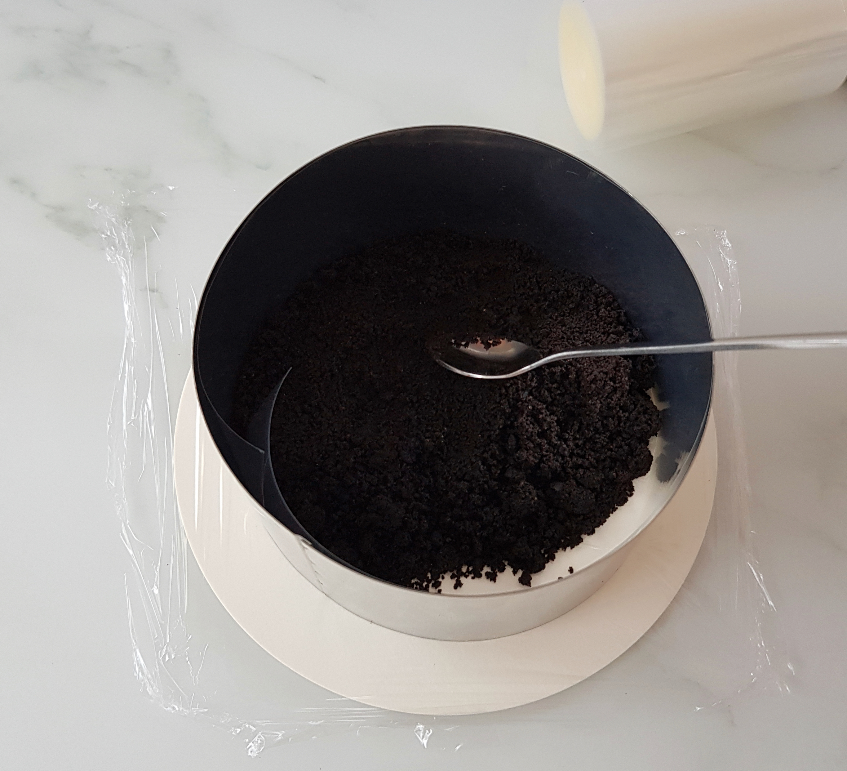 Dicho esto, comenzamos. Para preparar la base vamos a separar el relleno de las galletas y lo reservamos para la crema. Trituramos las galletas en un molinillo. Que no tenemos molinillo? Pues metemos las galletas en una bolsa tipo zip y con un rodillo las machacamos. Derretimos la mantequilla y mezclamos con el polvo de galletas hasta que se forme una especie de arena húmeda. Si vamos a utilizar un molde desmoldable, lo untaremos con mantequilla y colocaremos encima un círculo de papel vegetal y forraremos el contorno interior con una tira de acetato. Si vamos a usar un aro, pondremos film en la base y después colocaremos el aro grande sobre un plato plano o sobre una base para tartas. Echamos la galleta húmeda  y la aplanamos con una cuchara, espátula o incluso con los dedos, de manera que quede lo más uniforme posible. Y llevaremos a la nevera a enfriar y endurecer.