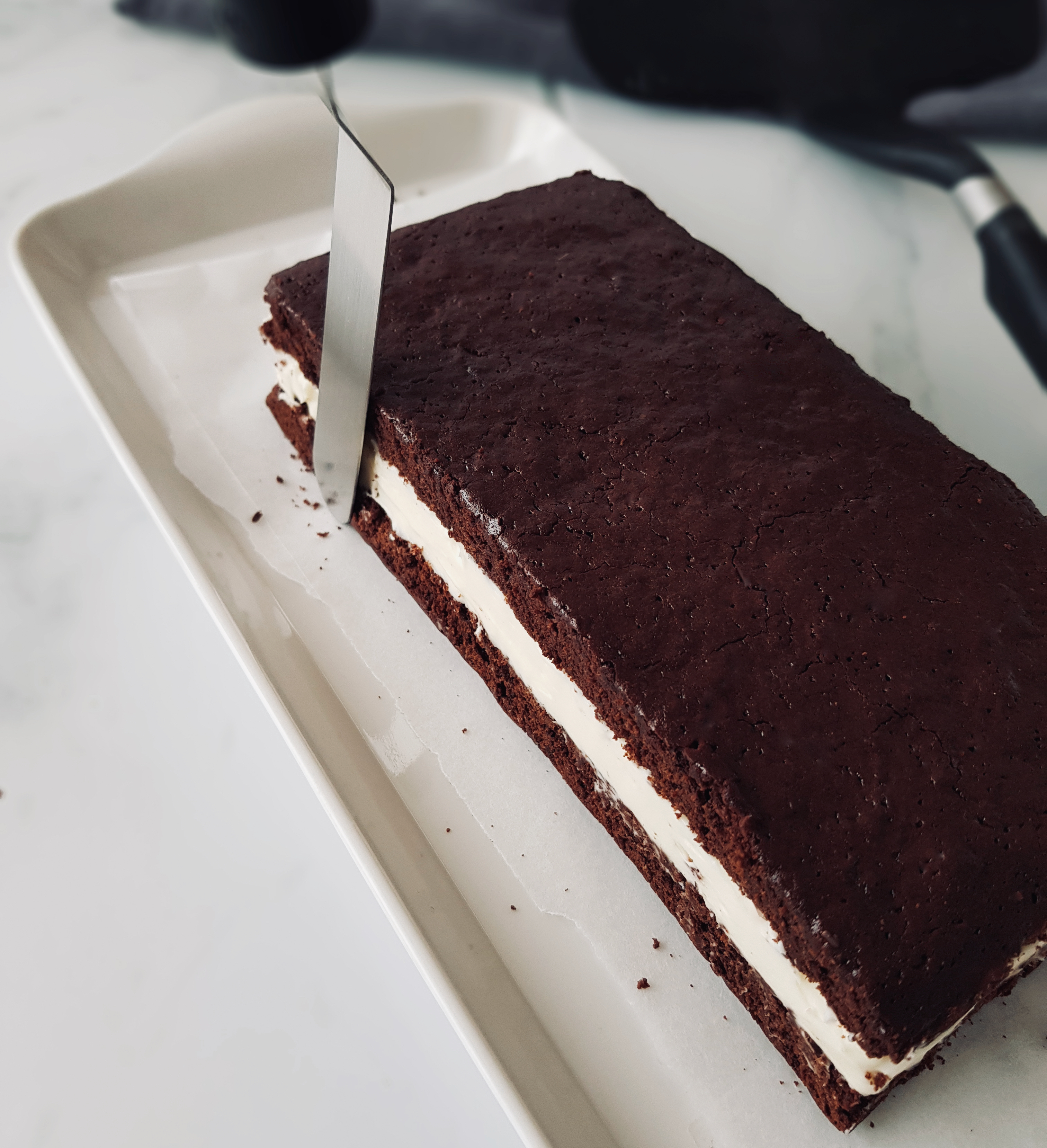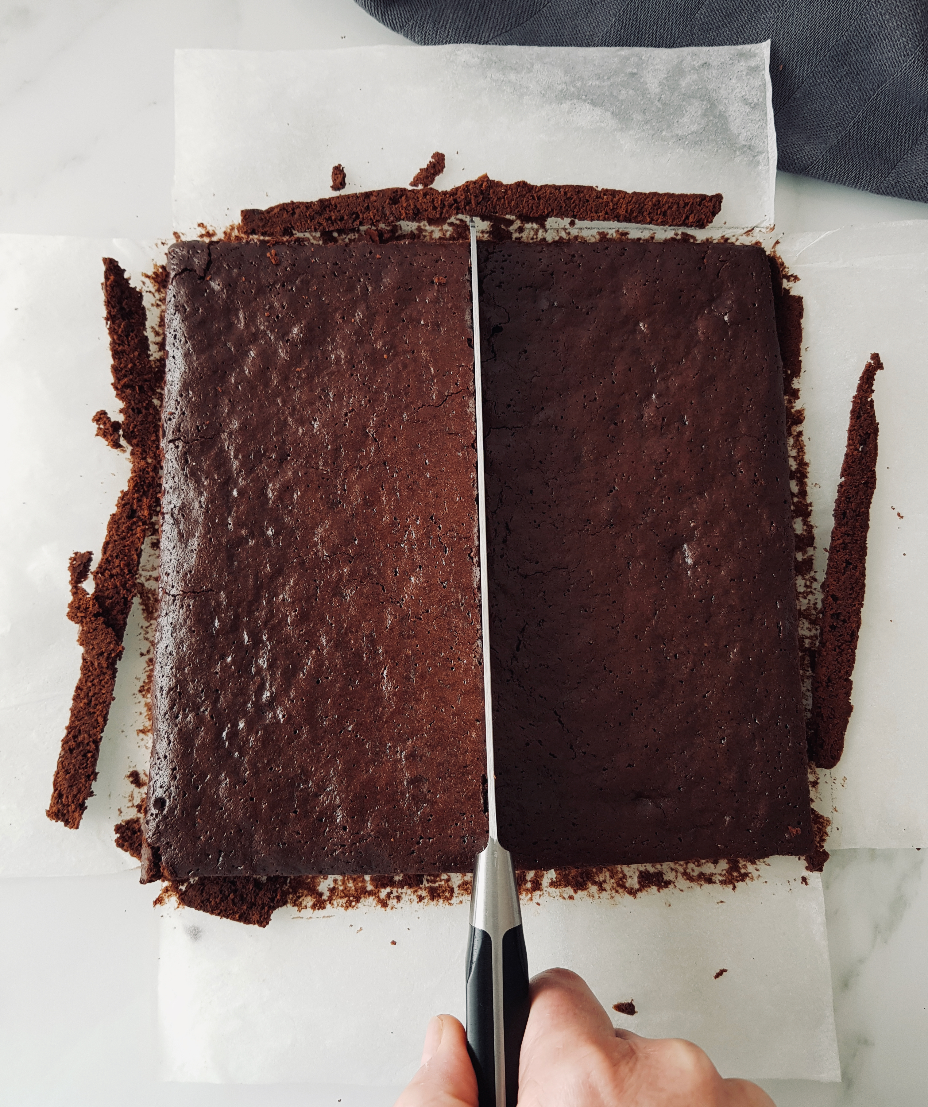 Previo a cortarlo en cuadrados mi consejo es que lo llevéis a la nevera a enfriar unas cuantas horas para que la crema se asiente y enfríe o de lo contrario es probable que la crema se salga por los lados. Utilizaremos un cuchillo de sierra para partirlo.