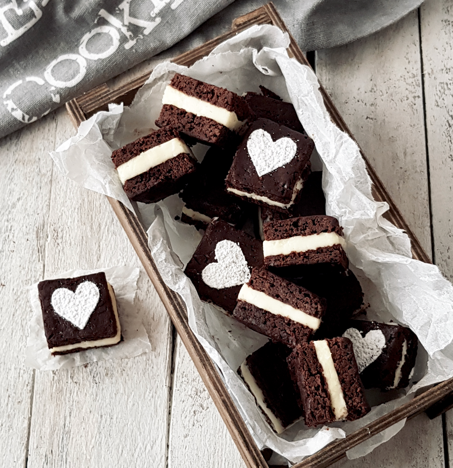 Finalmente colocamos una plantilla en forma de corazón sobre los cuadrados. Yo la he hecho con papel vegetal. Espolvoreamos azúcar glass por encima y retiramos con cuidado la plantilla.