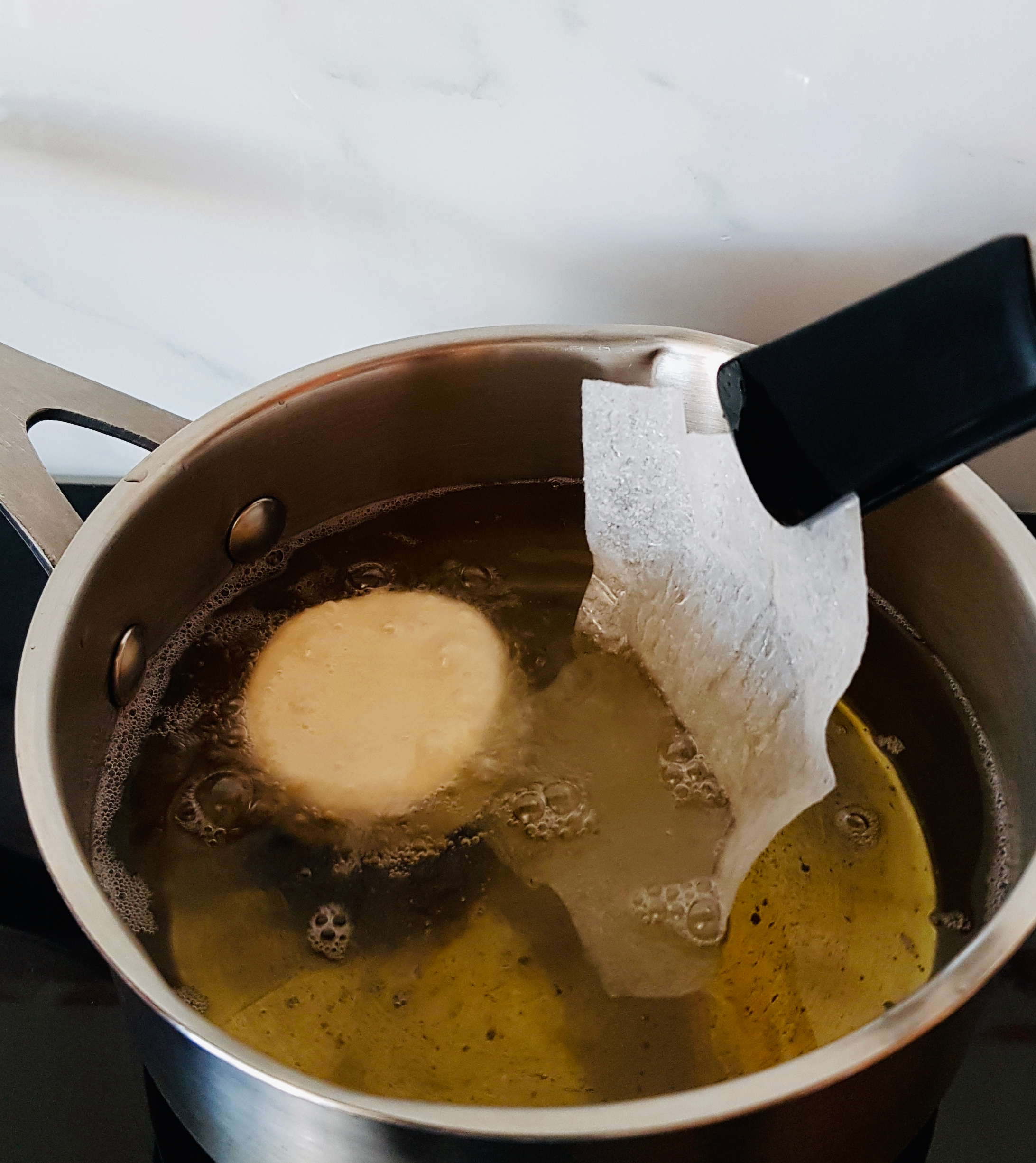 Una vez que han levado las piezas y veamos que se han puesto más gorditos (no tienen que doblar el volumen) toca freírlos. El momento fritura es clave para lograr unas berlinas esponjosas, hechas por dentro y doradas por fuera. Para ello, en un cazo vamos a poner abundante aceite y llevamos a calentar a fuego medio. Lo ideal es que el aceite alcance los 170-180ºC que podemos controlar con un termómetro de cocina. Si no disponemos de éste, pues haremos una prueba con uno de los bollitos. Importante: el aceite no ha de humear o significará que está demasiado caliente con lo cual las berlinas se quemarán rápidamente por fuera y quedará el interior crudo. Y ahora os explico el porqué de dejar reposar cada una de ellas en un papelito: es una masa tan blandita que si la cogemos con la mano la deformaremos, por ello las vamos a echar directamente con el papel al aceite, el papel enseguida se despegará y lo podremos retirar con unas pinzas.