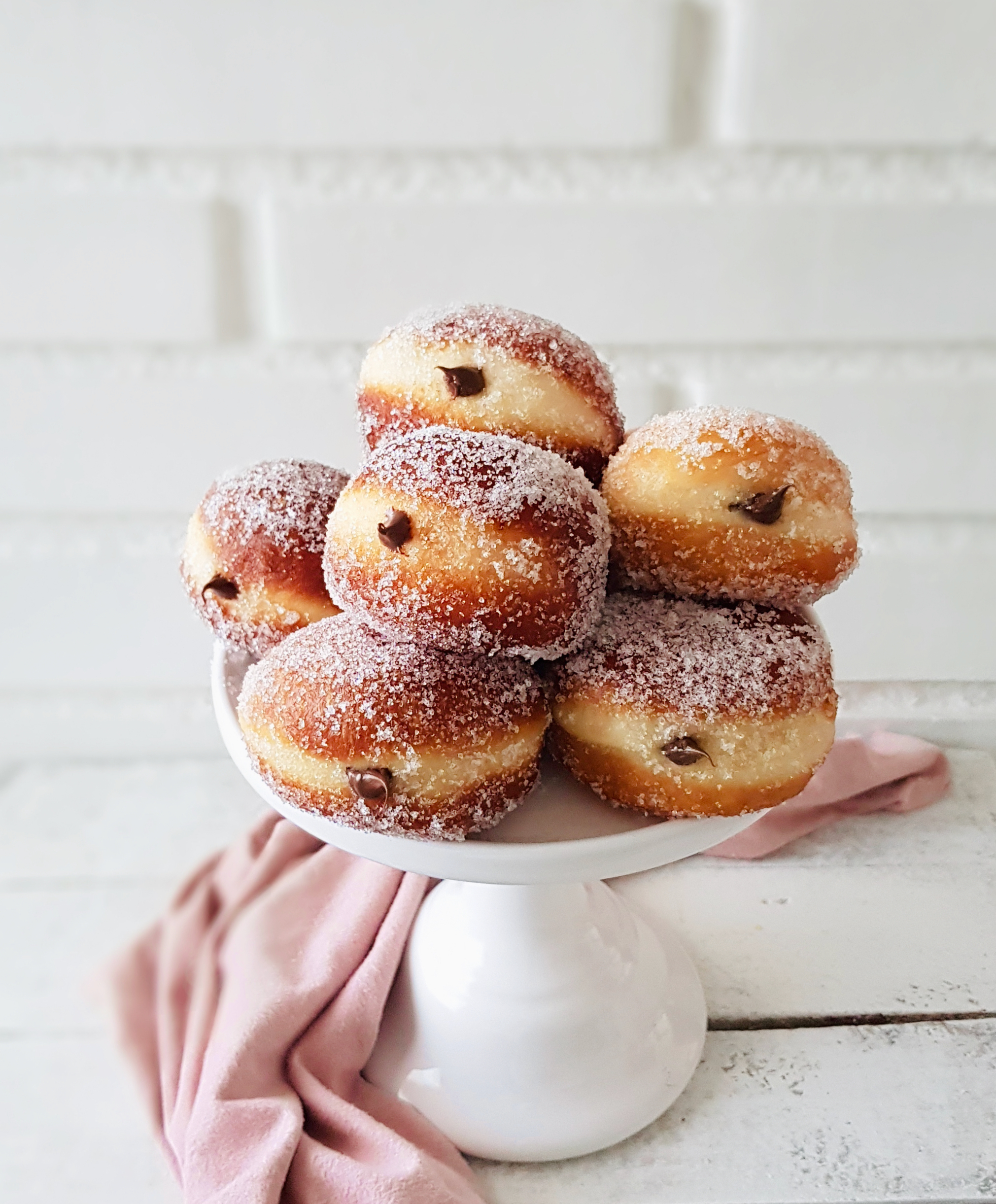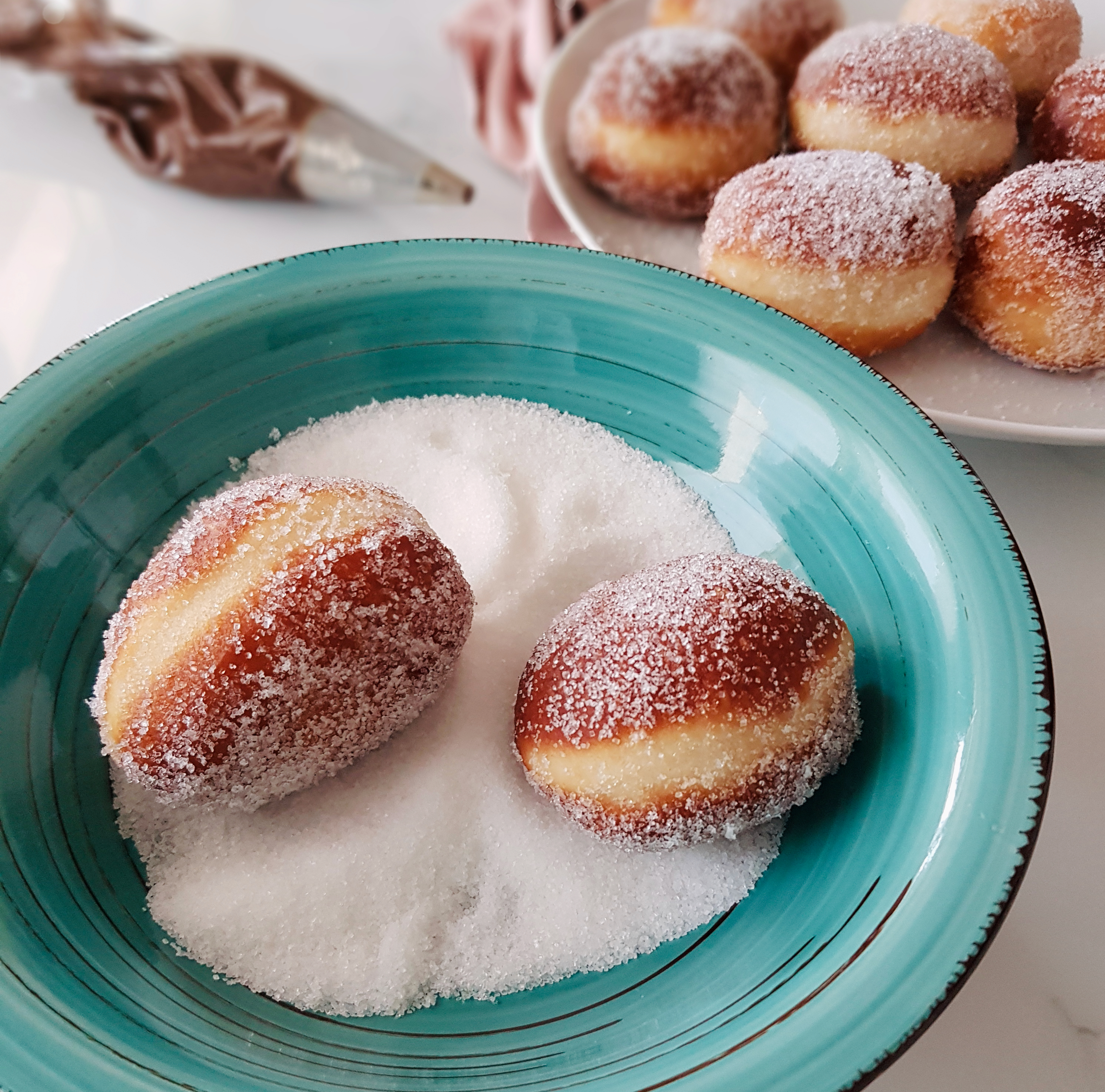 No conozco otro dulce que haya sido bautizado con tantos nombres como estos bollitos, en serio. Mirad, se les conoce como: beignets, berlinesas, bolas de Berlín, bombas, donuts sin agujero, bolas de fraile…. y es posible que aún me deje alguno. Son típicas de Alemania y allí suelen consumirse en carnaval. Se trata de unos bollitos mega esponjosos que se elaboran partiendo de una masa fermentada enriquecida con huevos, leche y mantequilla. Se les da forma circular y se fríen en aceite para posteriormente rebozarlos en azúcar.