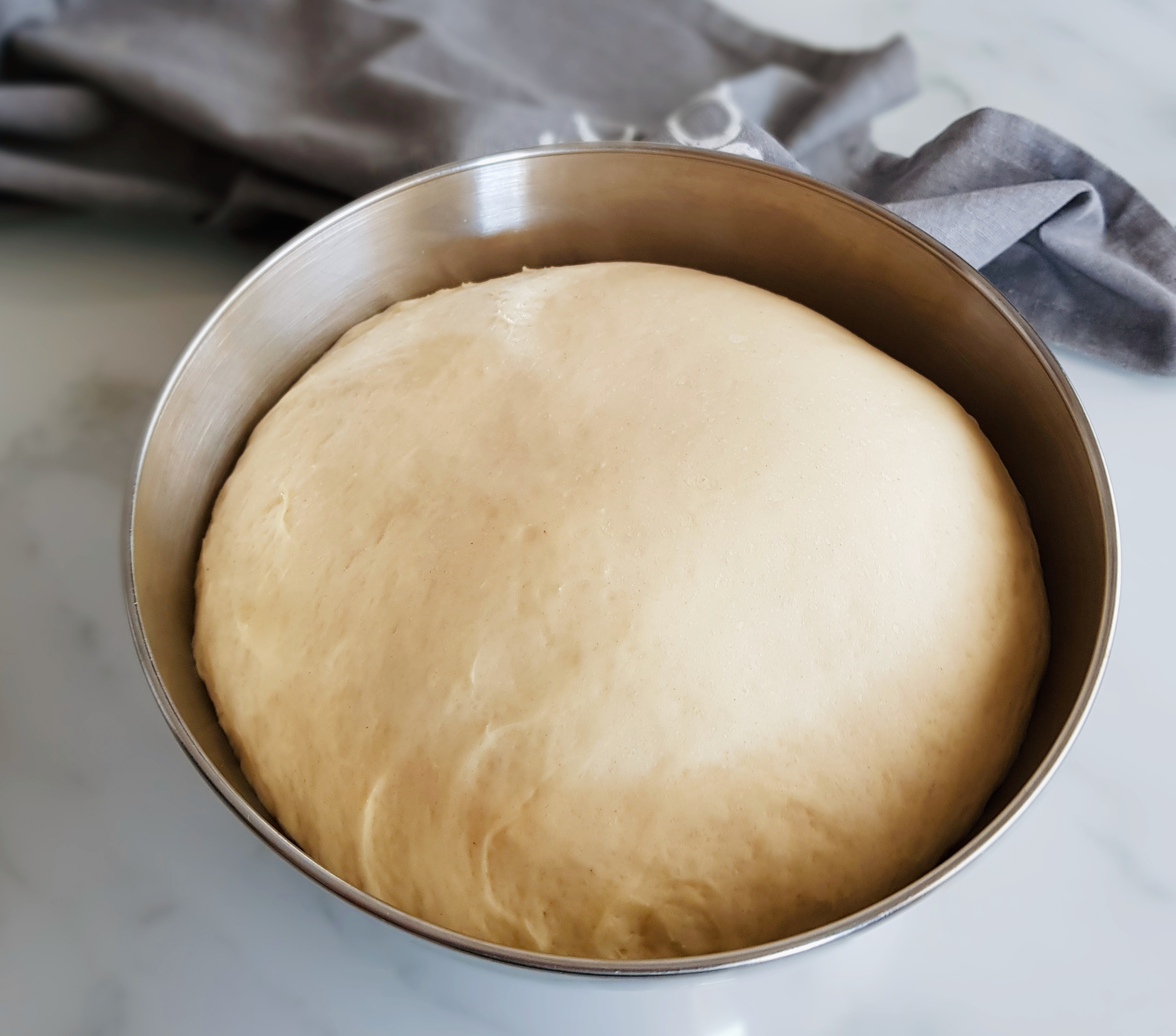 Una vez que ha levado, la desgasificamos con el puño y traspasamos a la superficie de trabajo ligeramente enharinada. Hacemos una bola de nuevo y sin moverla del sitio la cubrimos con un paño y la dejamos que repose otros 10 minutos para que se relaje y poder estirarla sin que se encoja.