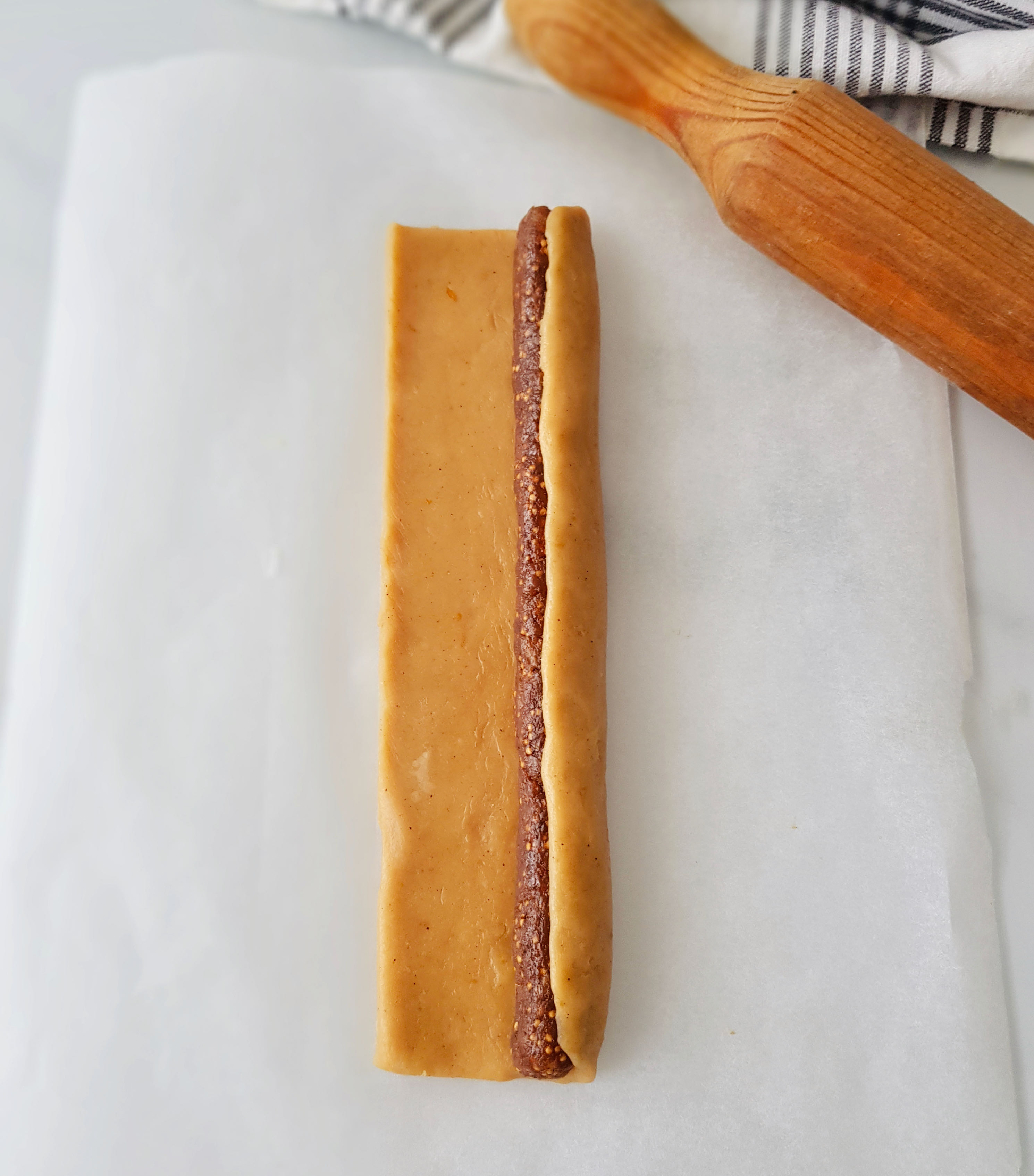 Sacamos la masa de galletas de la nevera. Entre dos hojas de papel vegetal y con ayuda de un rodillo la estiramos a lo largo dejándola de un grosor de unos 4mm. De ancho que tenga más o menos unos 7 cm a no ser que queráis hacerlas más grandes. Ponemos el rulo de pasta en uno de los extremos de la masa estirada y comenzamos a enrollarla.