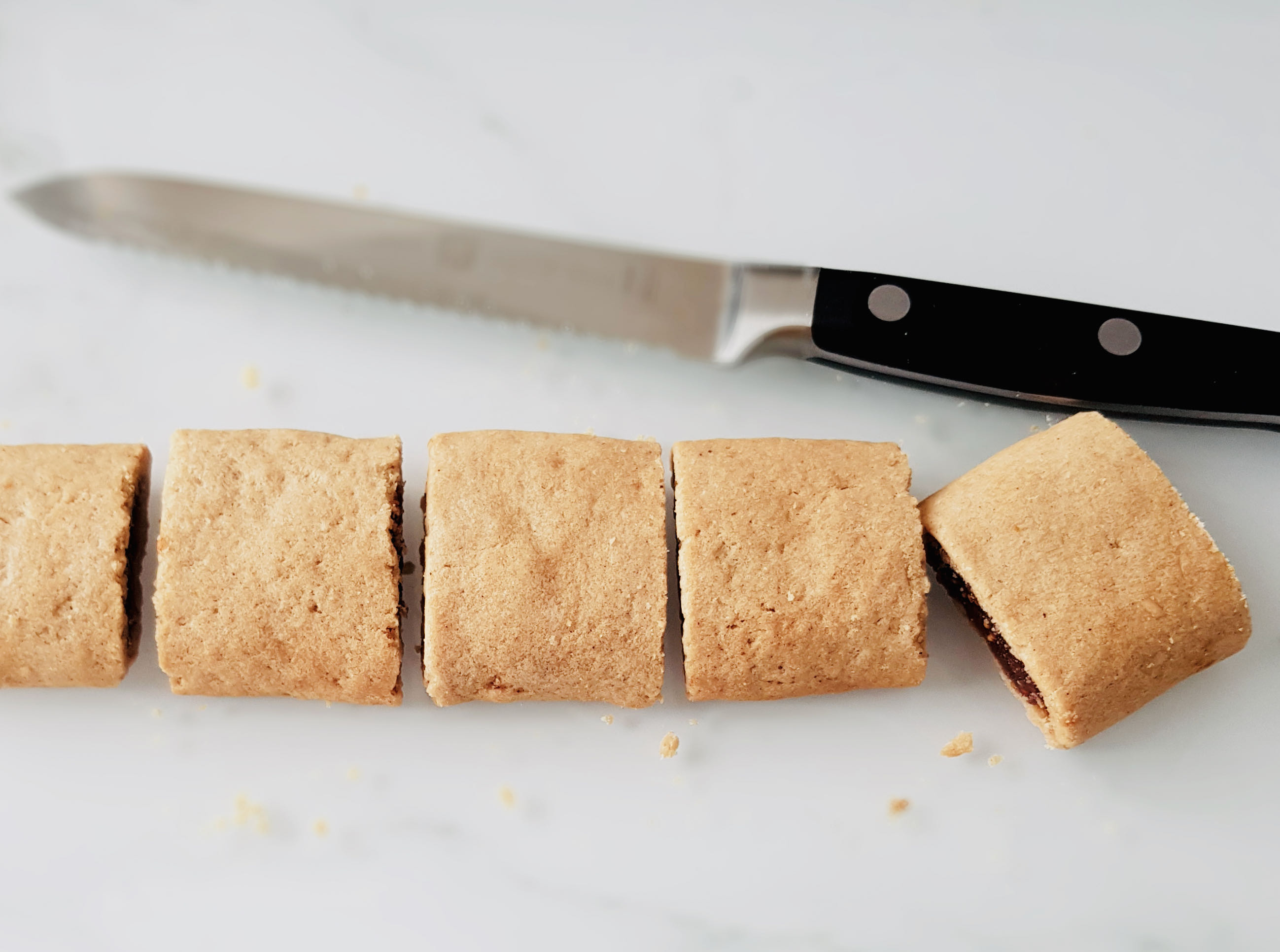 Retiramos del horno, traspasamos a una rejilla y dejamos templar. Con un cuchillo de sierra cortamos las galletas del tamaño que queramos, en este caso son de 3 cm.