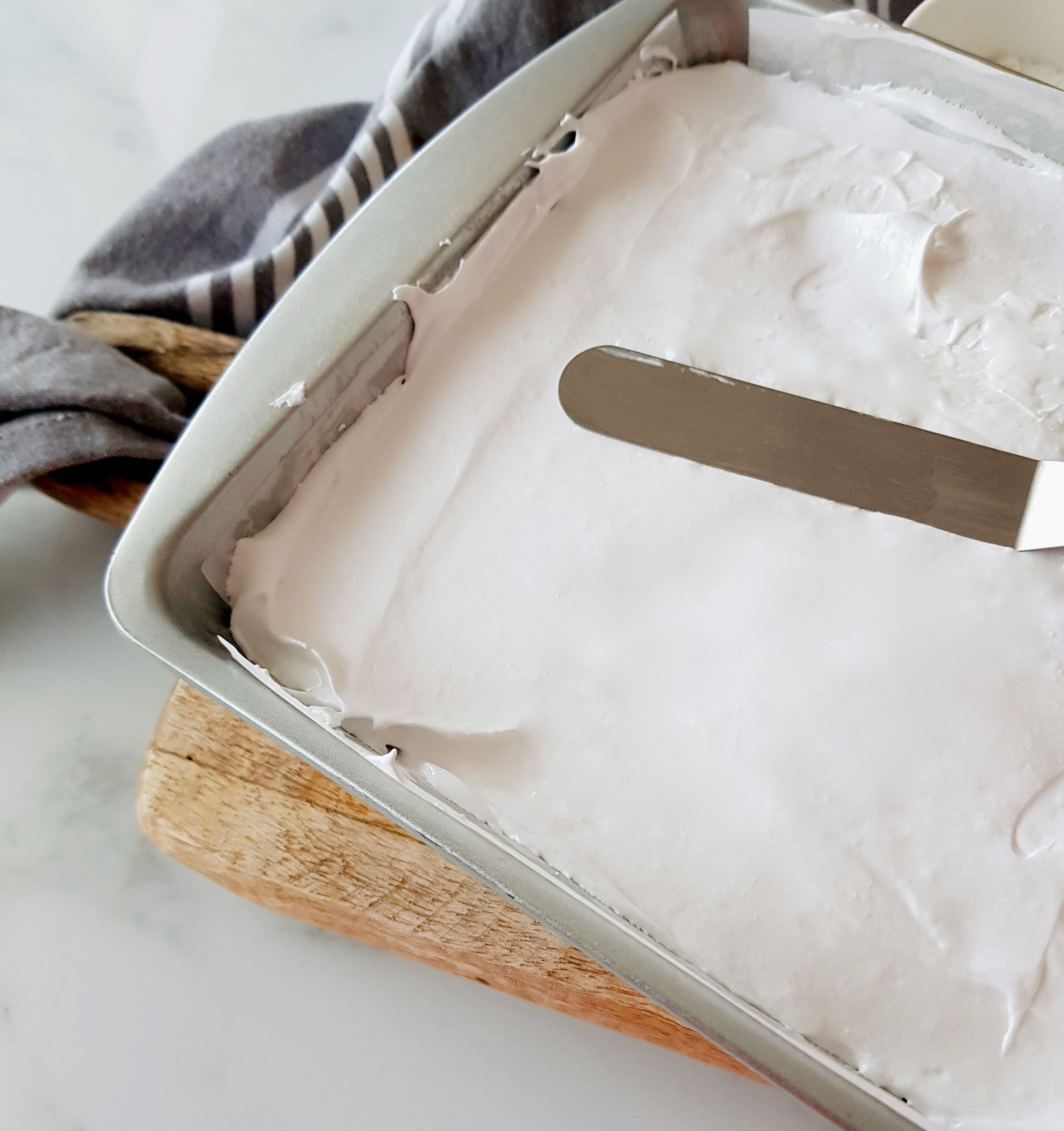 Dejamos reposar un mínimo de tres horas antes de cortar las porciones. Vamos a preparar ahora un cuenco con azúcar glass y almidón de maíz (maizena) a partes iguales. Con un cernidor o colador espolvoreamos la superficie de trabajo. Invertimos el molde para que caiga el malvavisco sobre esa fina capa de azúcar glass y almidón. Retiramos el papel vegetal y espolvoreamos también por encima. Ahora con un cuchillo largo y afilado lo dividimos en cuadrados. Para que no se nos pegue la mezcla al cuchillo también lo hemos de espolvorear, después de cada corte. Una vez que hemos cortado todas las piezas, las pasamos por la nuevamente por la mezcla y las sacudimos ligeramente para retirar el sobrante.