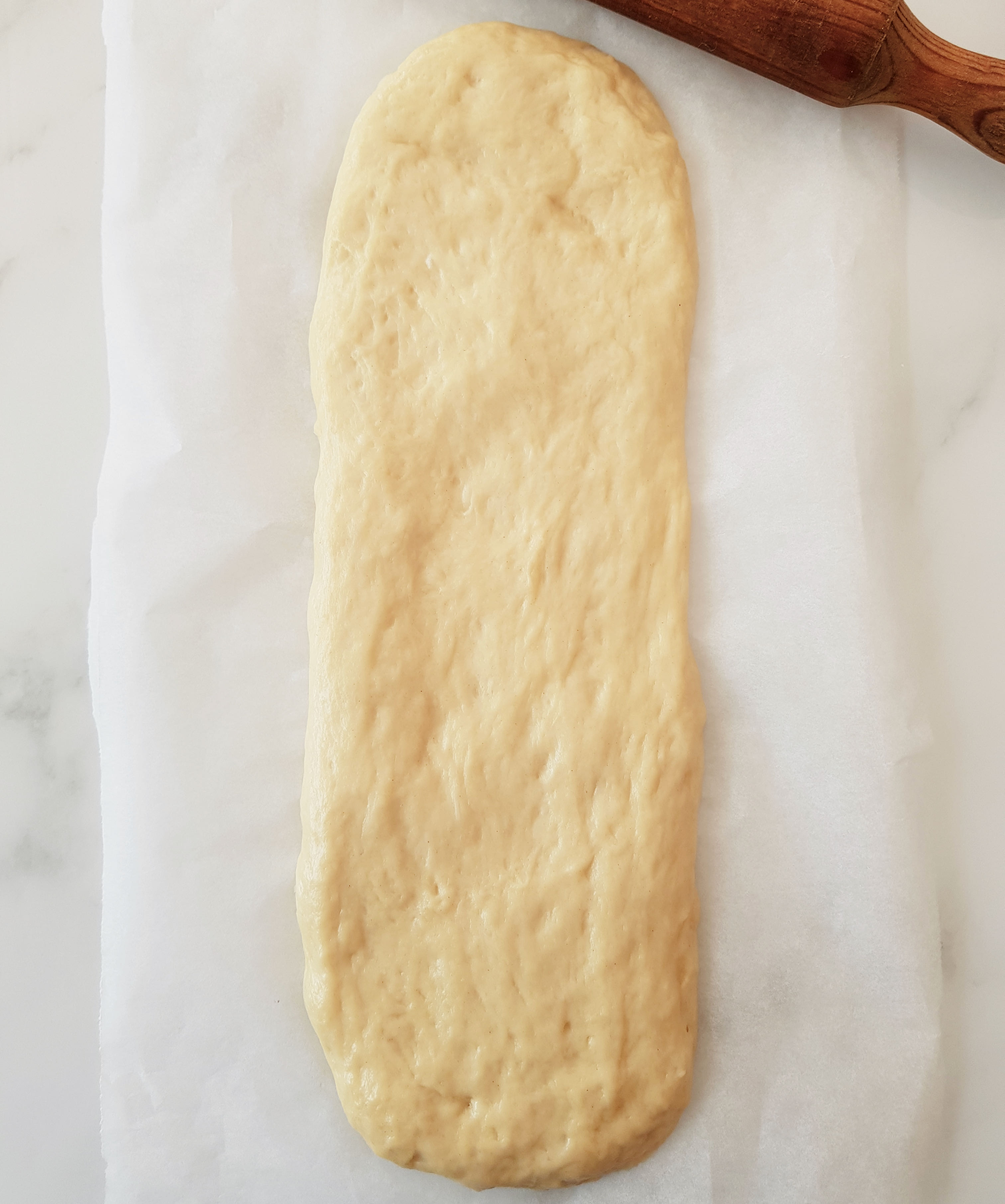 Volvemos a engrasar la superficie de trabajo y con ayuda de un rodillo estiramos la masa a lo largo dejándola con un grosor de 1 cm aprox. Para traspasarla a papel vegetal la enrollaremos sobre el rodillo y la desenrollaremos sobre el papel. Si se ha encogido la estiramos un poco más.
