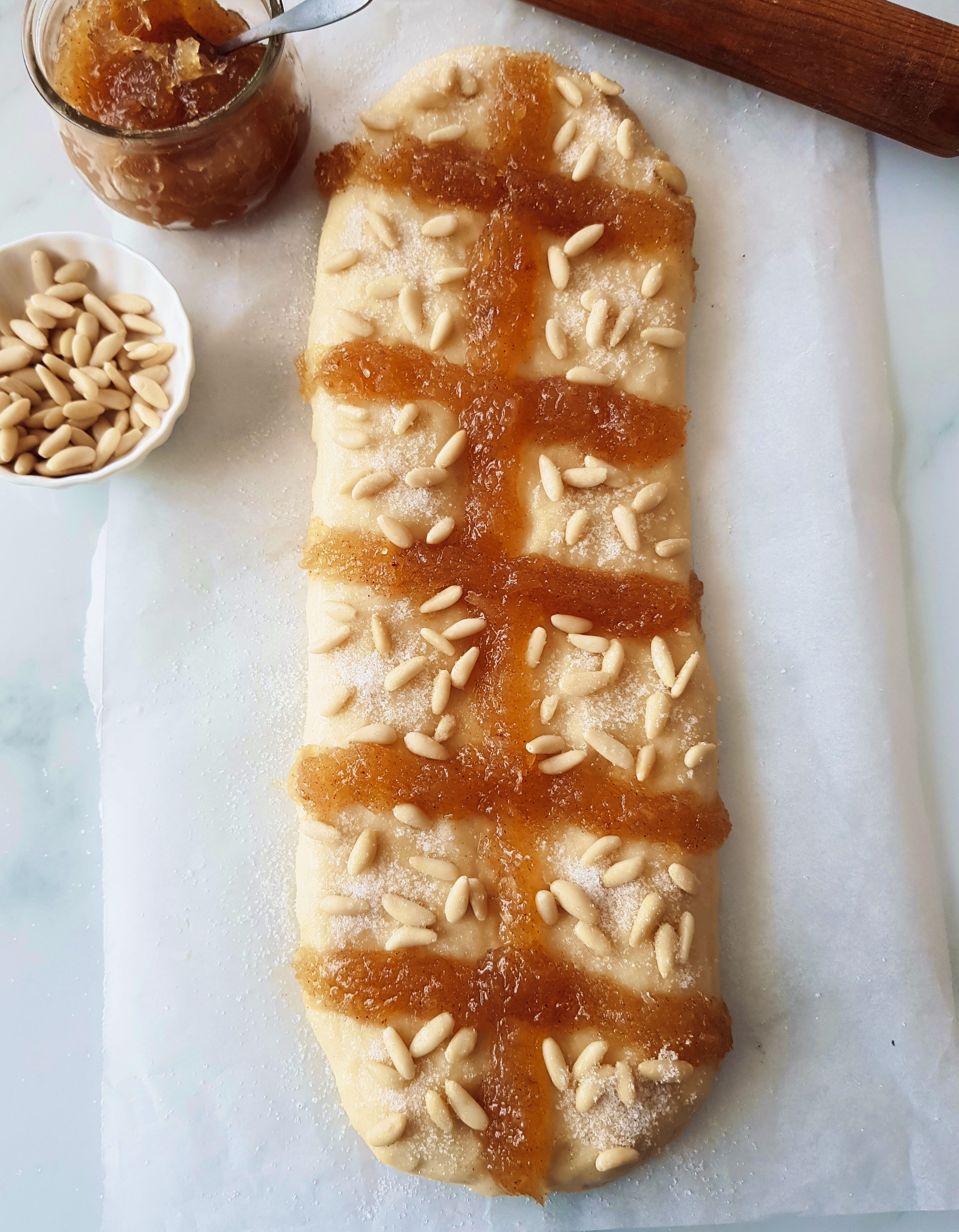 Distribuimos el cabello de ángel formando el dibujo que más nos guste, esparcimos los piñones y espolvoreamos azúcar por toda la coca. Un truquito para que los piñones no se quemen durante el horneado es dejarlos en remojo durante 1/4 h, después los escurrimos y secamos con papel de cocina. De todos modos alguno siempre se tuesta de más, pero por lo general quedan tostados pero no quemados. No la vamos a pincelar con huevo, ni leche…. nada.