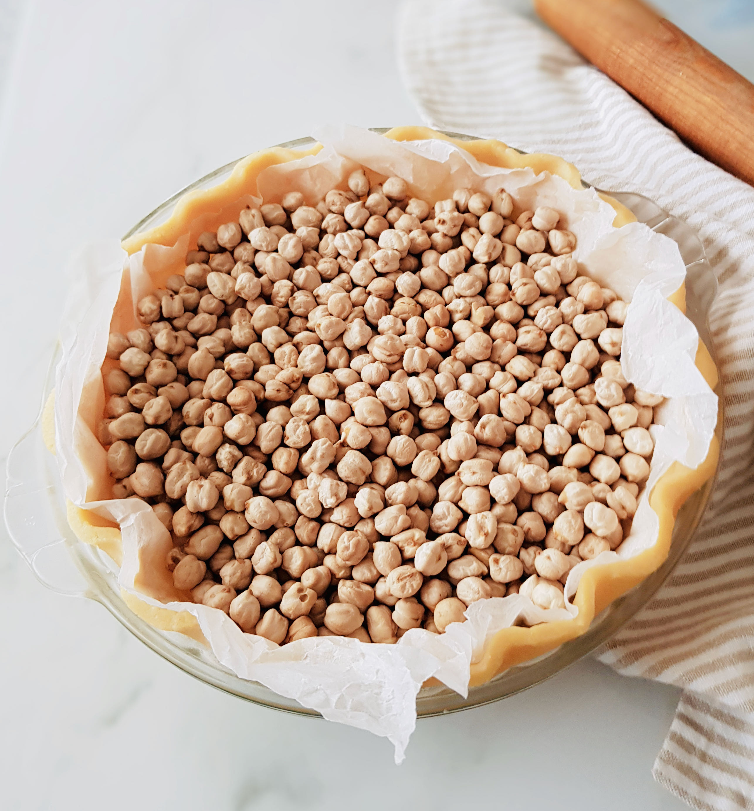 Precalentamos el horno a 175ºC con calor arriba y abajo. Vamos a hacer un horneado en blanco o, lo que es lo mismo, cocinar la masa sin el relleno. Por una razón muy sencilla y es que, si no lo hacemos así y ponemos directamente el relleno en la masa cruda, la humedad del relleno será absorbida por la masa y el resultado será una base de tarta empapada y blandurria en lugar de crujiente y hojaldrada. Y no me digáis que no es frustrante que después de haberla elaborado con todos los detalles para que nos quede divina de la muerte, se nos vaya al traste por ser unos correndillas. Si el relleno no fuese tan líquido podemos ponerlo directamente sobre la masa cruda, pero en este caso no os lo recomiendo. Bien, pues para que la masa no se infle en el horno, aparte de pinchar la base le vamos a poner peso encima. Así pues, le colocamos una hoja de papel vegetal arrugada y encima ponemos unas legumbres secas. Venden unas bolas de porcelana expresamente pensadas para esto pero con los garbanzos nos apañamos igual de bien. Luego no los tiréis a la basura, los dejáis enfriar y guardáis en un tarro de cristal para otras veces.