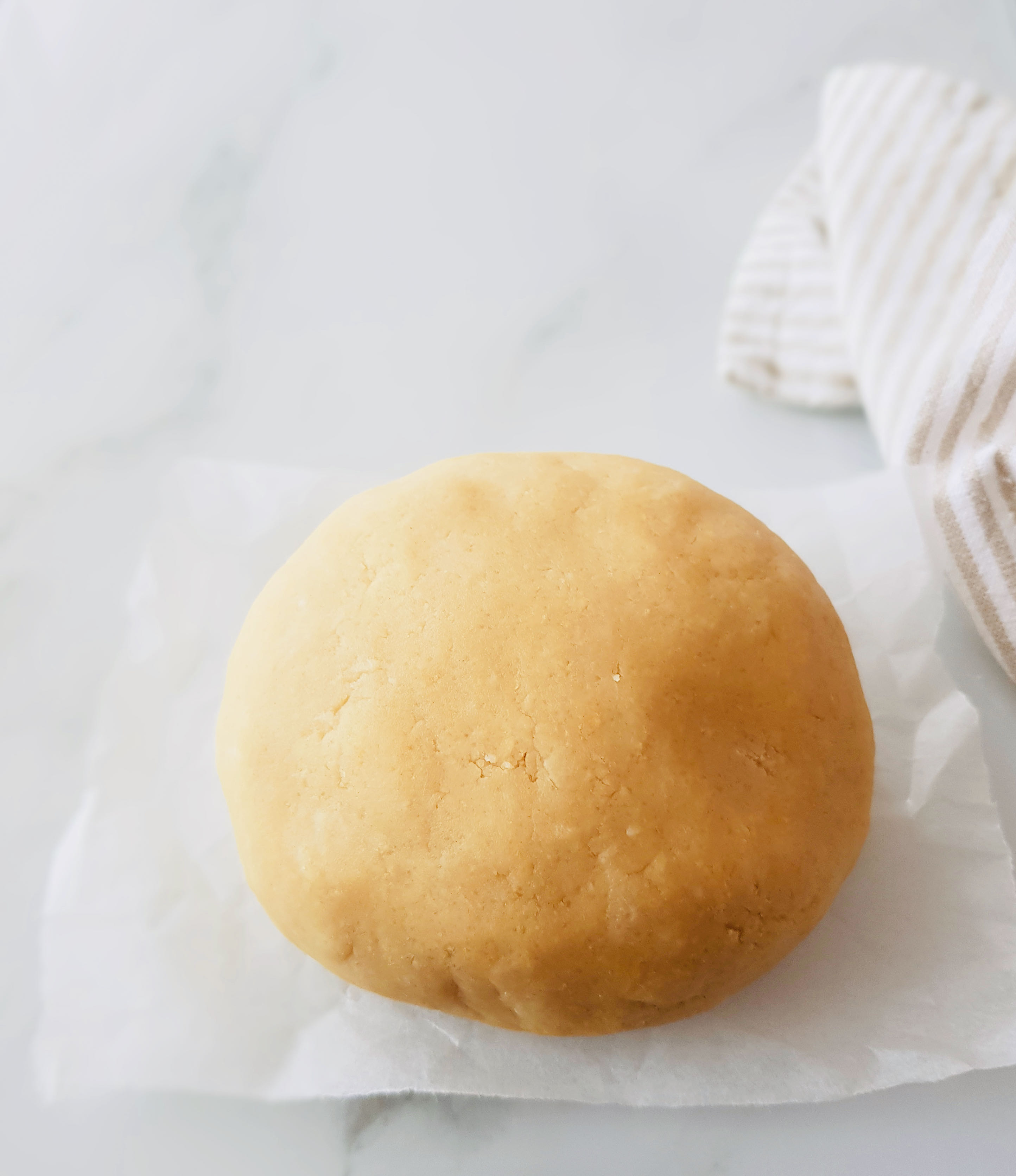 Para hacer casos va genial tener una amasadora o un robot de cocina ya que la masa se elabora con rapidez y la mantequilla se mantiene fría. Si la vamos a hacer en amasadora utilizaremos el accesorio de pala. Pero vamos, ya os digo que sin maquinaria queda igual de bien, de hecho yo esta vez la he formado a mano porque no me apetecía ensuciar la amasadora. Formamos una bola que envolvemos en film y llevamos a enfriar a la nevera un ratito, sobre 1/4 h, no mucho más porque endurecerá demasiado y nos costará estirarla.