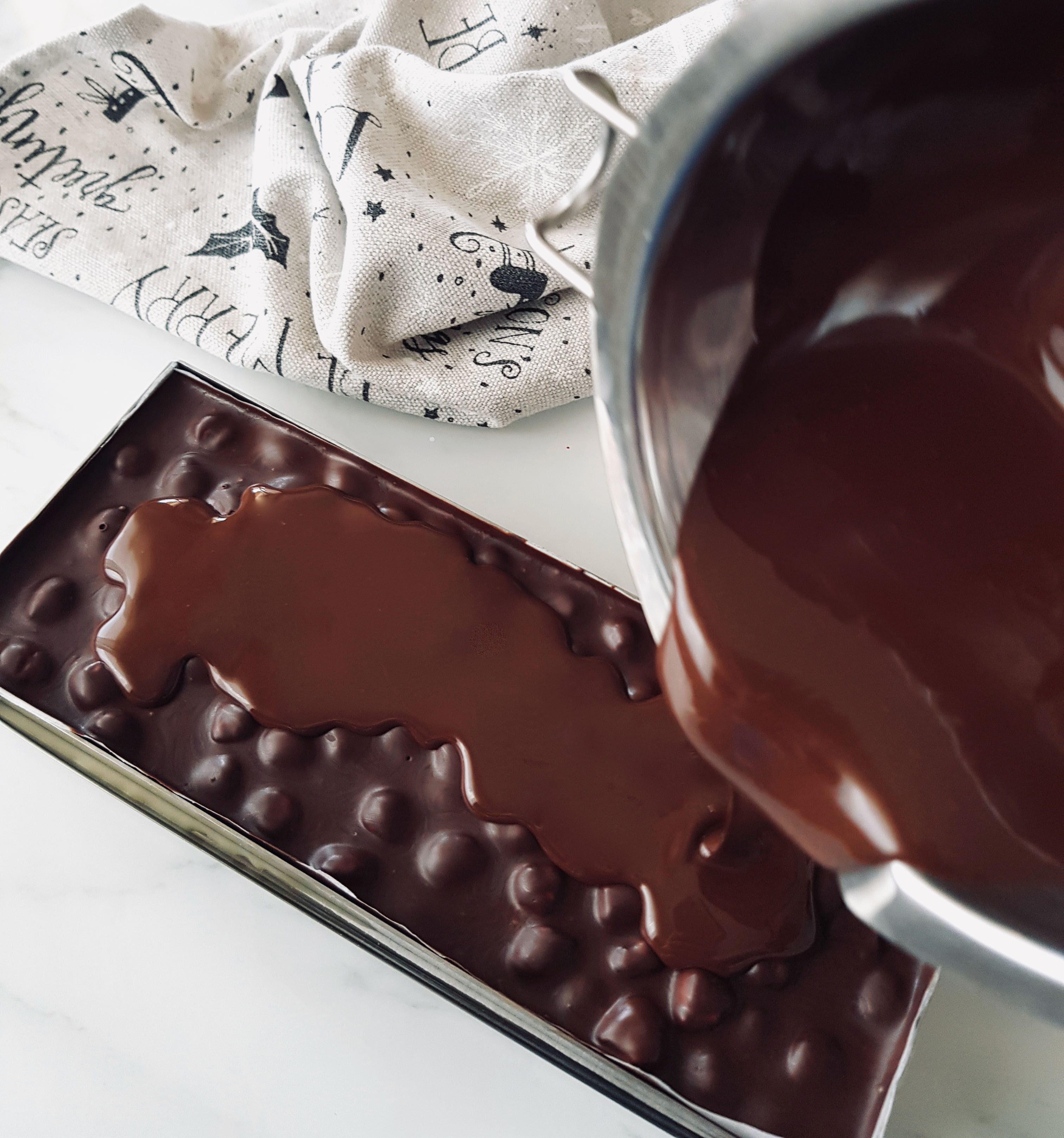 Si no hubiera utilizado el chocotransfer lo habría dejado así tal cual y lo serviría como se muestra en la foto, es decir, la parte plana abajo y la de las avellanas marcadas hacia arriba, me parece que queda precioso. Pero, como en este caso el turrón hay que voltearlo para que se vea el dibujo, la base quedaría irregular, por lo que vamos a verter una última fina capa de chocolate fundido para terminar de cubrir las avellanas y que nos quede liso. Así que, volvemos a repetir la operación derritiendo el chocolate de la capa final con la manteca y vertemos sobre la capa de chocolate con avellanas previamente endurecida.