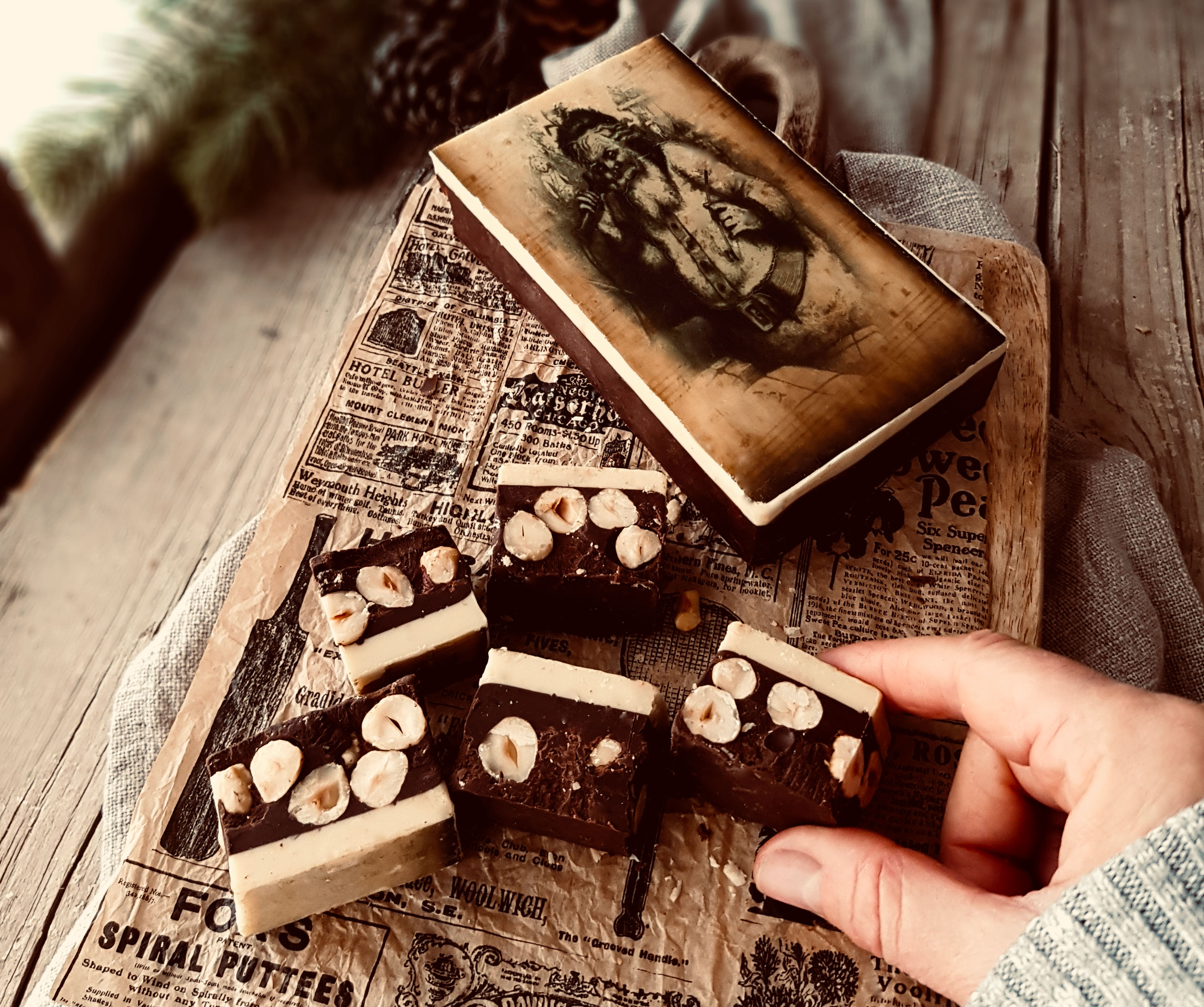 Y si teníamos poco con eso, yo os propongo preparar un turrón de chocolate y avellanas que lucirá precioso en vuestras bandejas de dulces. Es el clásico turrón de chocolate pero al que le vamos a dar protagonismo con ese dibujo vintage tan navideño. Se trata de una lámina de chocotransfer, una especie de calcomanía comestible para entendernos. Esta lámina tiene dos caras: una en tono mate que es de manteca de cacao y que será la que entre en contacto con el chocolate y otra cara brillante que es de acetato. Hemos de tener especial precaución de no arañar la parte mate ya que es muy delicada y se ralla con facilidad estropeando el dibujo, lo cual afectaría al resultado final. Estas láminas las podemos encontrar fácilmente en páginas web de artículos de repostería. En este caso, el dibujo lo busqué por internet y lo encargué imprimir con las medidas del molde de turrón. Para que los colores del chocotransfer se mantengan intactos se han de transferir a chocolate blanco, de ahí que así sea la primera capa y el resto de chocolate negro. Aunque también podemos hacerlo todo de chocolate blanco con pistachos por ejemplo…. Cada cual que lo haga como más le guste. Evidentemente, no es imprescindible usar una impresión comestible. Y en cuanto al molde de turrón, si no disponemos de él podemos apañarnos perfectamente con un recipiente rectangular o recortando un simple cartón de leche. Así que no hay excusa 😉