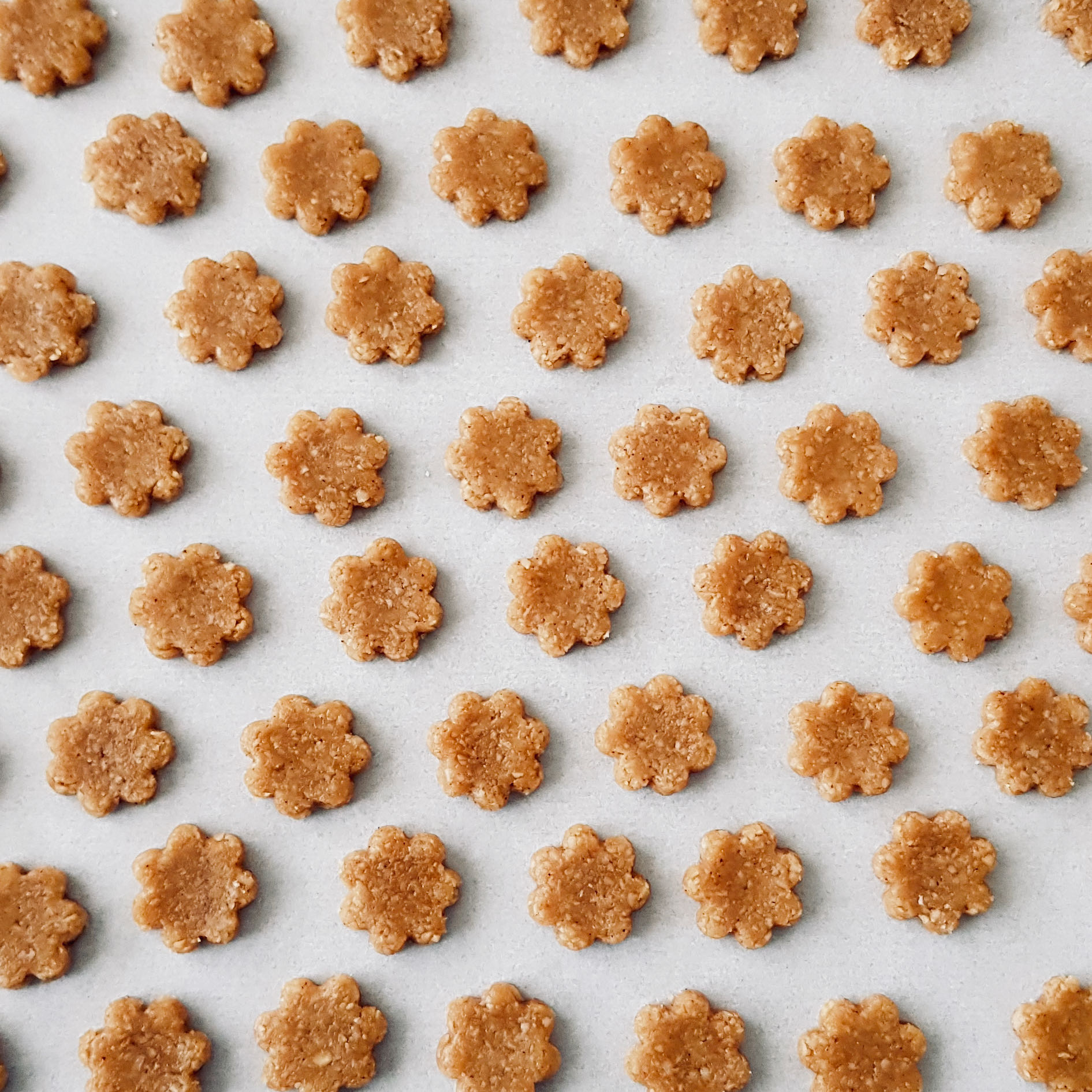 Las vamos a ir dejando sobre una bandeja forrada con papel vegetal. No suelen expandirse en el horno por lo que no es necesario dejar mucho espacio entre ellas. Si se nos queda enganchada la masa al cortador lo pasamos previamente por harina. La masa sobrante la unimos y repetimos la operación hasta terminar con toda.