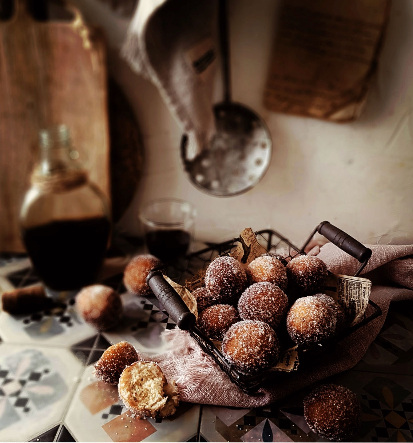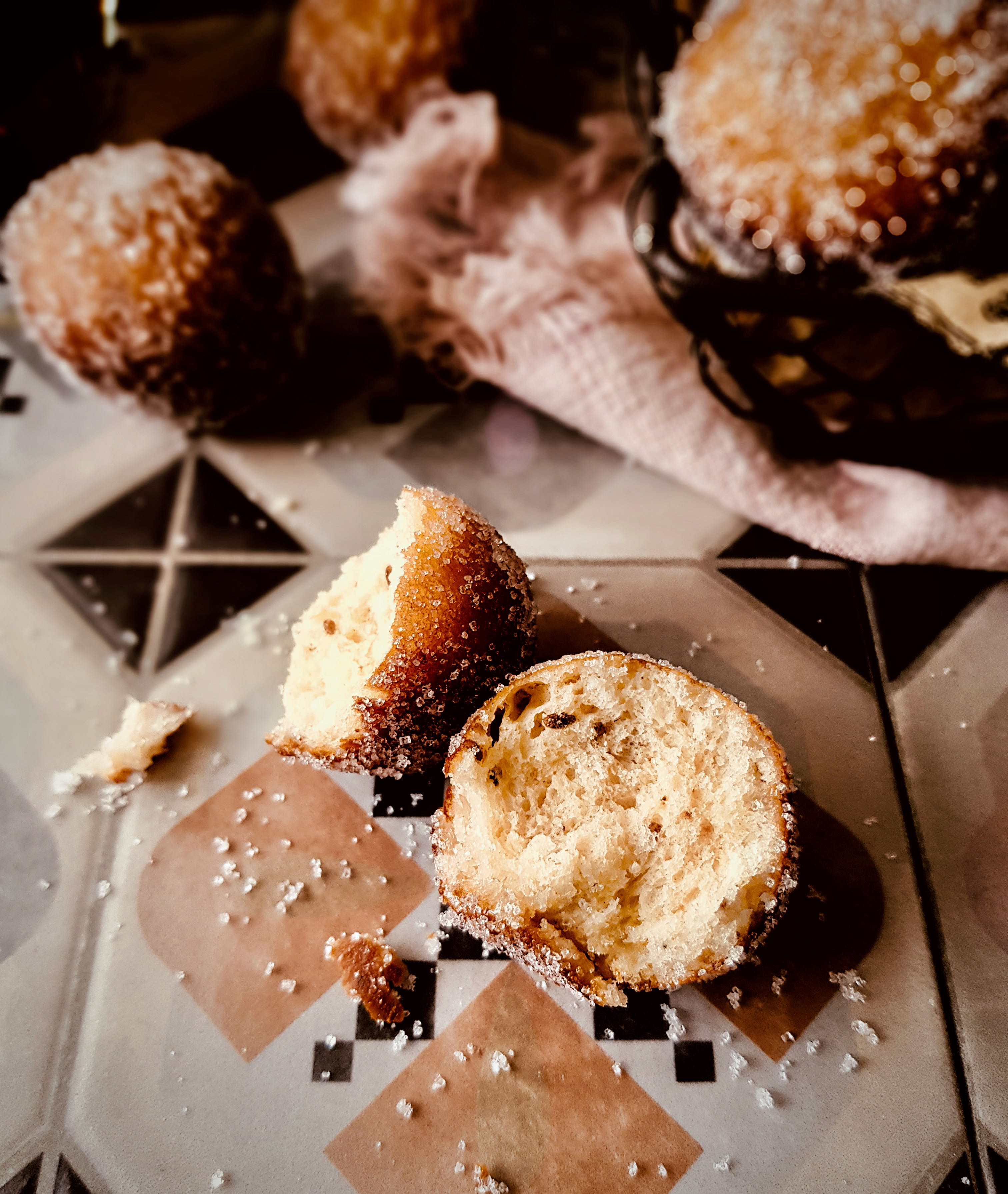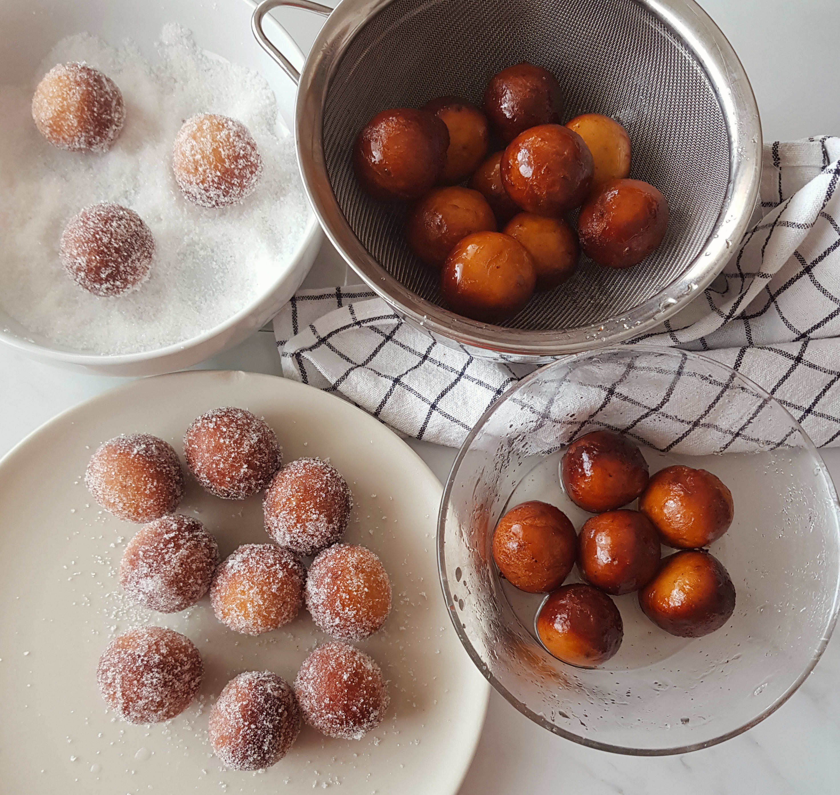 Ya solo nos queda darles el baño en el almíbar de anís, dejarlos escurrir en un colador y rebozarlos en azúcar. El almíbar mejor que esté un pelín caliente para que el buñuelo se lo embeba. Puedo deciros que estos buñuelos ganan en sabor conforme pasan las horas porque se asientan lo aromas. Aunque también es cierto que al ser una pieza de bollería pues esa ternura inicial se pierde un poco. Por ello, lo ideal es conservarlos en un recipiente hermético.