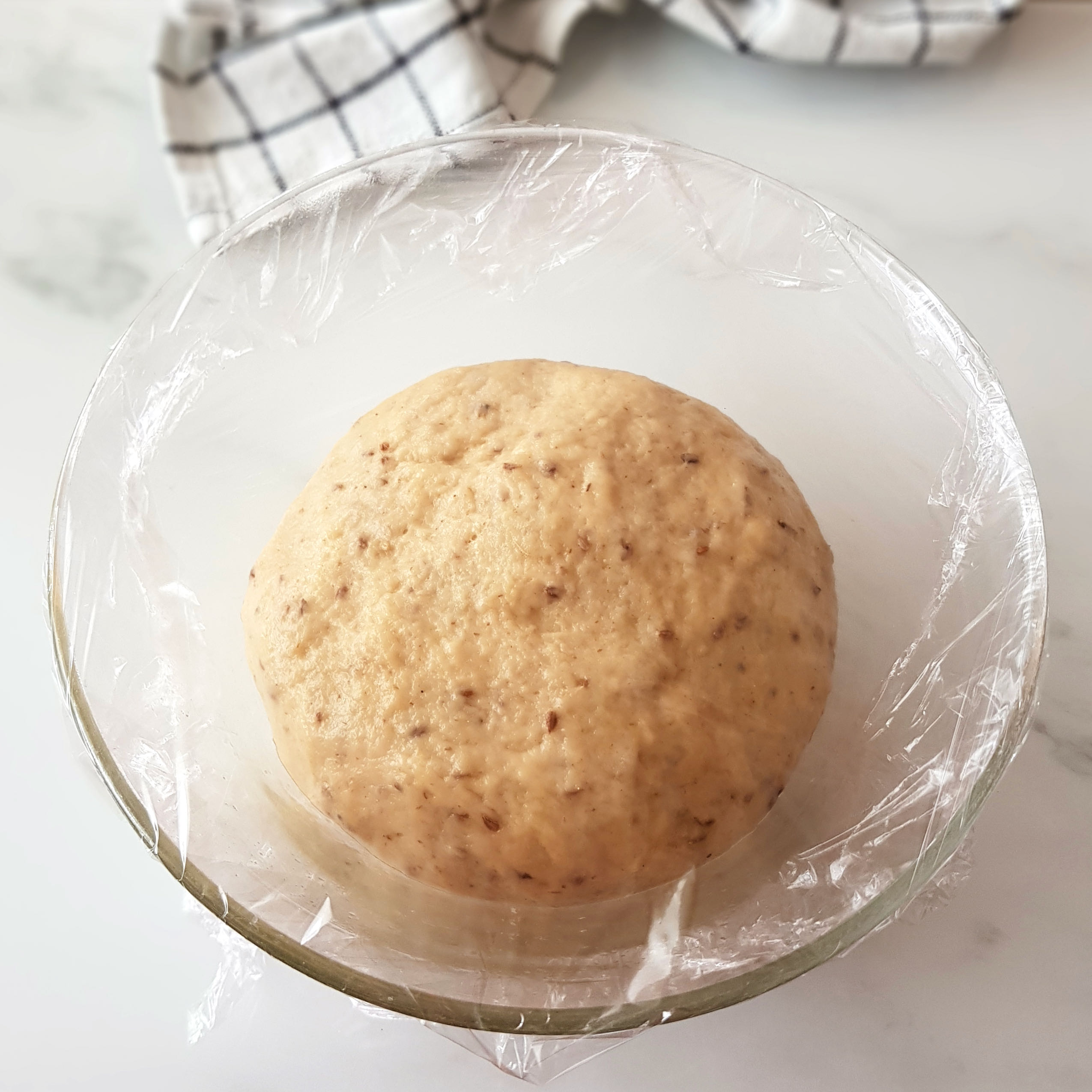 Engrasamos un recipiente amplio, ponemos la masa dentro y cubrimos con film transparente.