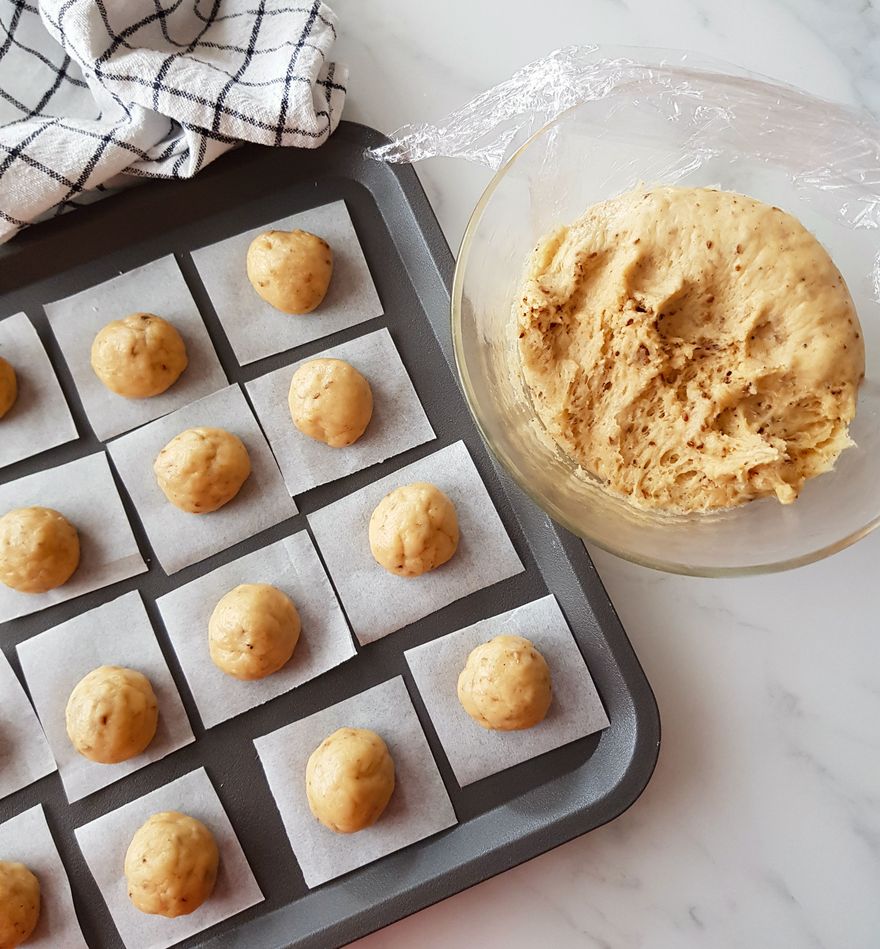 Una vez que la masa ha levado la desgasificamos con el puño y vamos cogiendo porciones de unos 20 g. Formamos las bolitas y las vamos a ir dejando sobre los trozos de papel vegetal. Cubrimos con film y dejamos levar nuevamente durante 1 hora más (ó 1/2 h en horno precalentado y apagado).