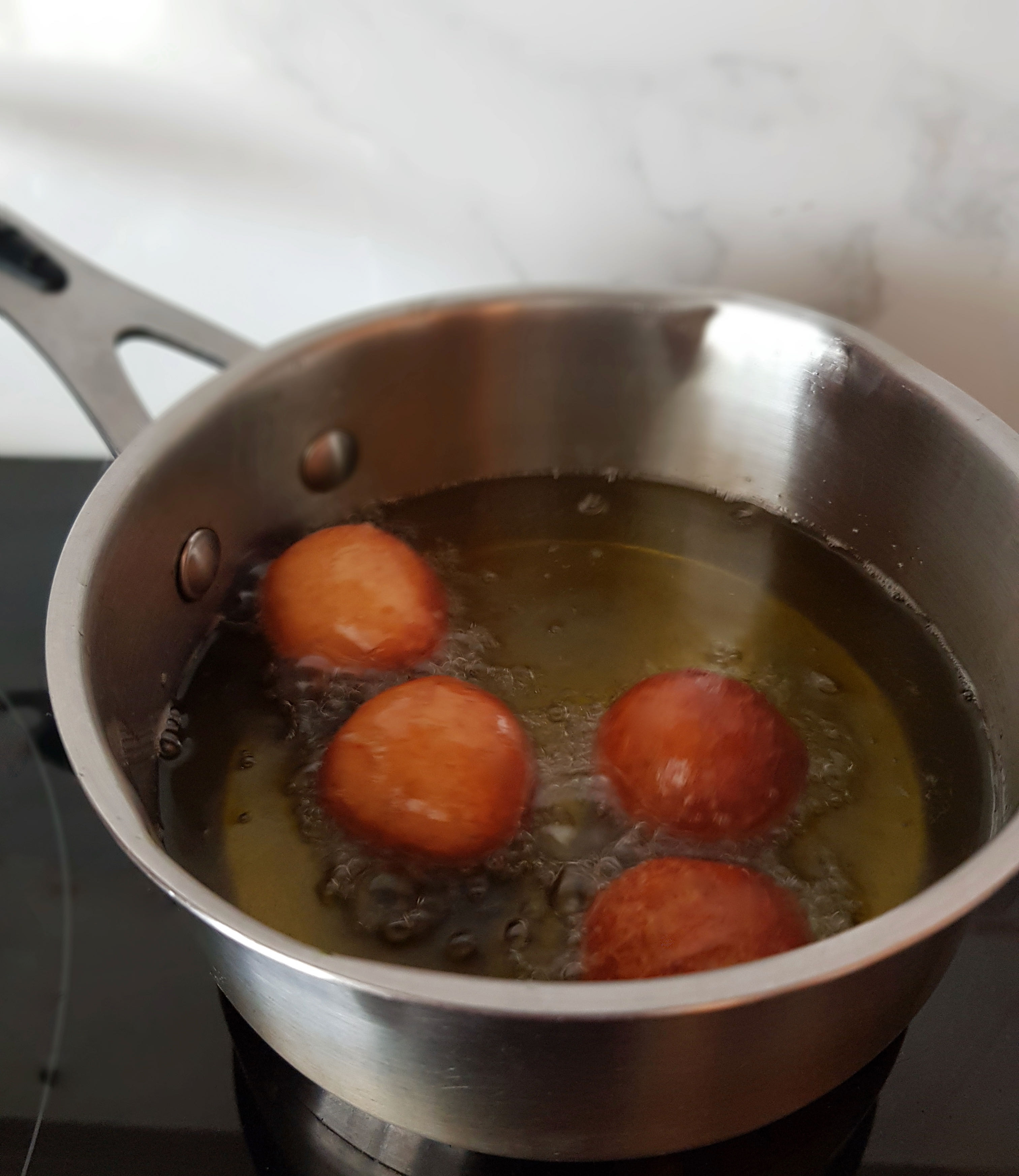Una vez que han levado las bolitas ya las podemos freír. Utilizaremos un aceite de oliva suave o de girasol para que no les aporte sabor. El momento fritura es clave. Lo ideal es utilizar un cazo con abundante aceite para que floten. El aceite ha de estar caliente pero no humeante o de lo contrario nuestros buñuelos se quemarán por fuera y el interior quedará crudo. Podemos probar primero con uno para ajustar la temperatura y el tiempo de cocinado. No es conveniente freír muchos de una vez para que no baje la temperatura, ya sabéis que si el aceite está frío los buñuelos lo absorberán quedando grasientos y con corteza gruesa.