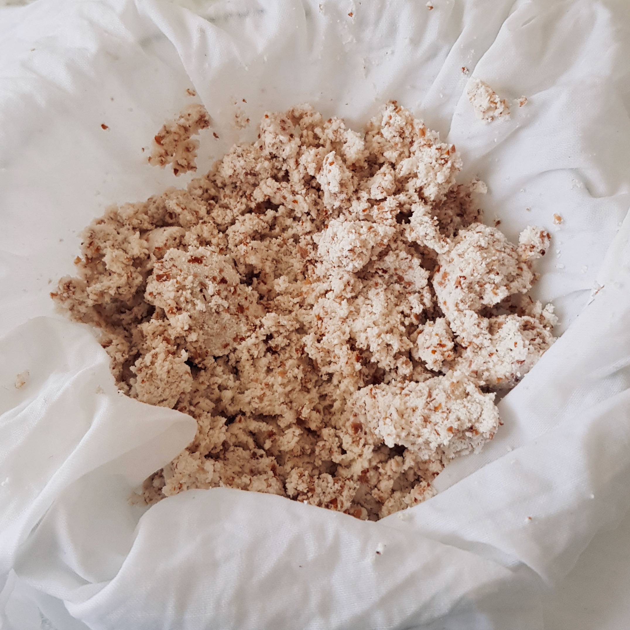 Hacemos un atillo y estrujamos bien con las manos para extraer todo el jugo posible y que en el interior solo quede la pulpa de la almendra.