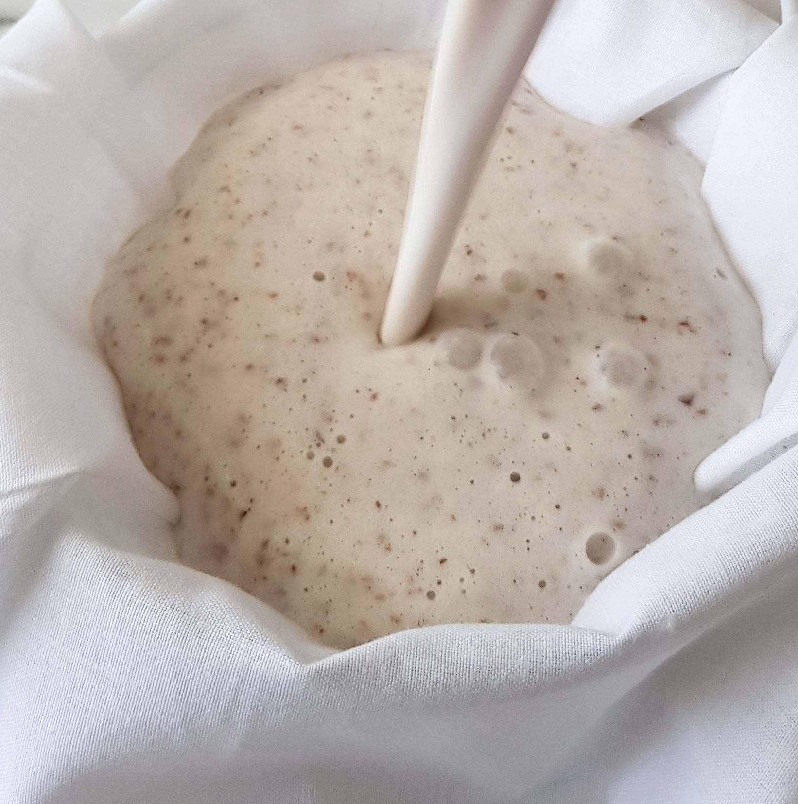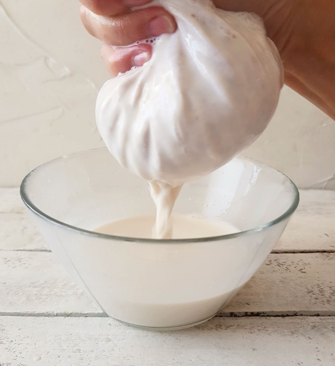 Trituramos a velocidad máxima, añadimos el resto del agua y terminamos de triturar. A continuación la filtramos a través un colador de tela a un cuenco grande. En el mercado encontraremos bolsas especiales para hacer leches vegetales aunque también podemos utilizar un trozo grande de tela de algodón limpio como en este caso.