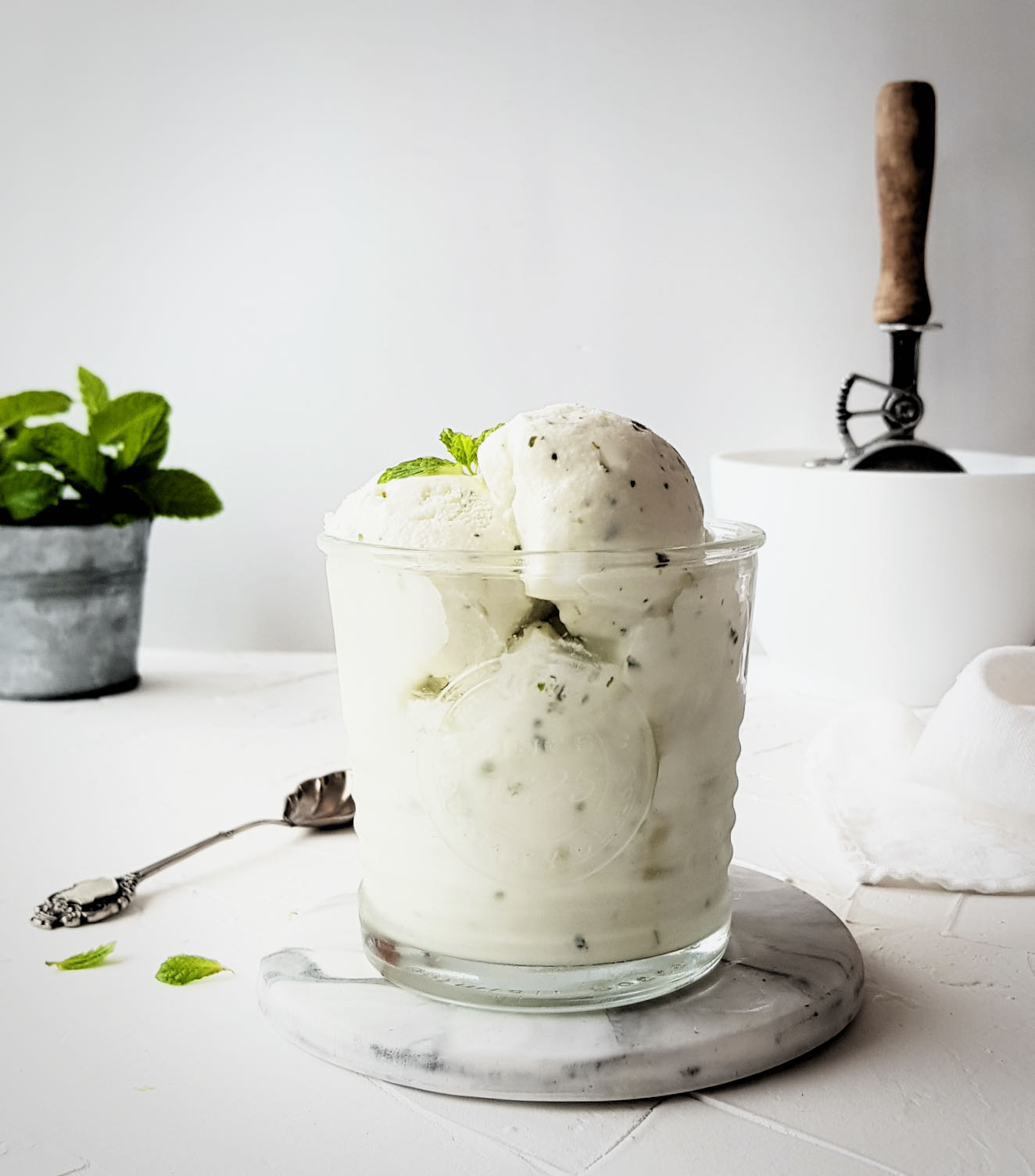 Con la llegada del buen tiempo me gusta tener siempre una macetita de hierbabuena en mi cocina. Me encanta frotar las hojas entre mis dedos, el olor tan intenso que desprende me recuerda mucho a esas tardes-noches de verano, de mojitos en un chiringuito de la playa y en buena compañía. Ayyyy que ganitas de vacaciones que tengo!! La hierbabuena o yerbabuena (aceptado por la RAE) es una planta muy versátil a la que podemos sacar mucho partido y muestra de ello es este rico helado. Os cuento cómo hacerlo: