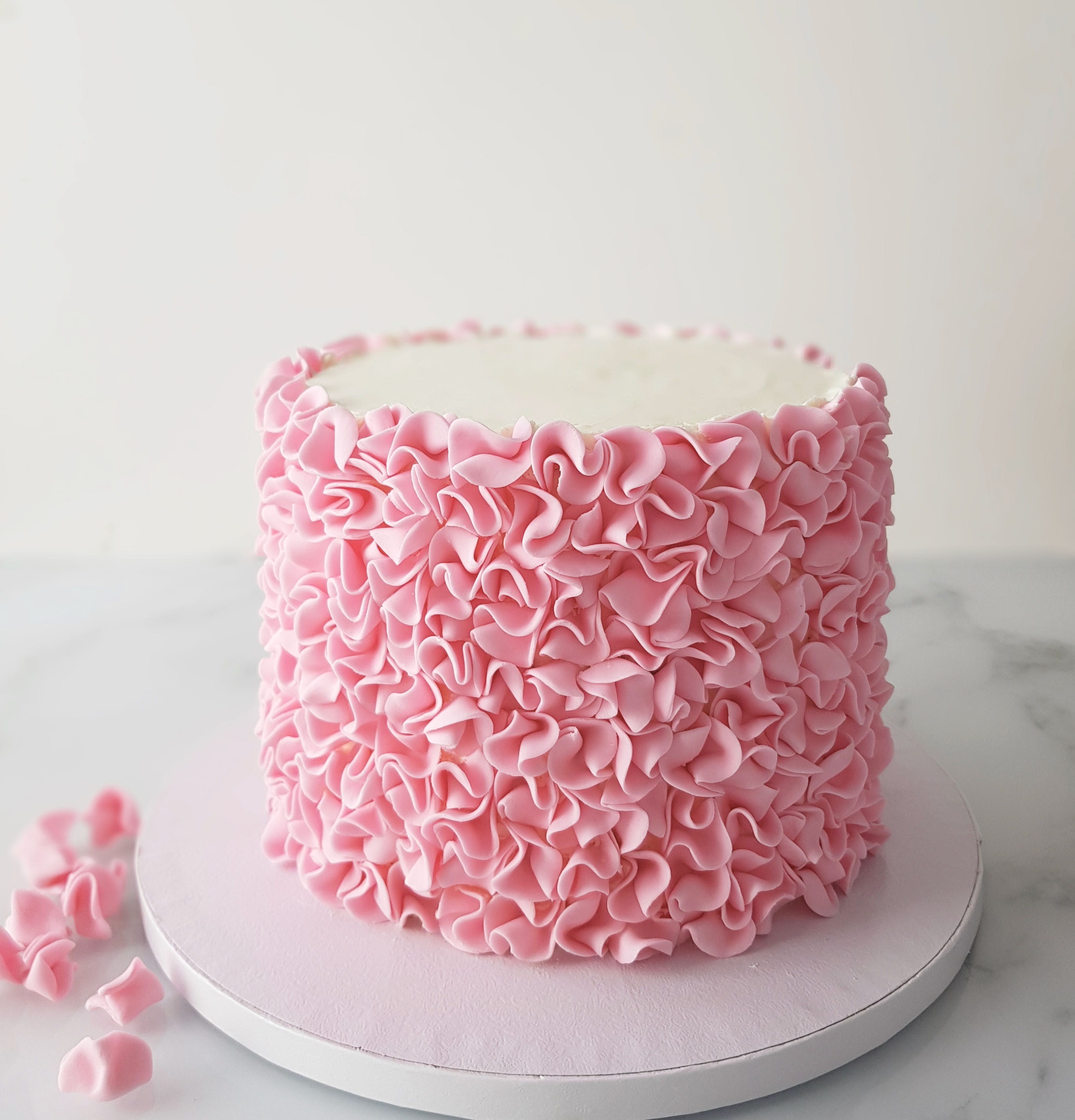 Una vez terminado el montaje del bizcocho base había que cubrirlo con las piezas de fondant rosa, de manera que encajaran y no quedasen huecos. Santa Paciencia!! 🙂 En este punto tengo que deciros que tengo una espinita clavada ya que mi idea era hacer los mismos adornos pero con papel de arroz y mucho más grandes, como si fueran volantes. Pero claro… nunca he utilizado este ingrediente, probé de hacerlos y me costaba mucho trabajarlo porque no lo dominaba y, con el tiempo en mi contra….. pues como que no era momento de experimentos, así que finalmente decidí poner los que ya tenía hechos y que también me gustaban. Aunque sinceramente, la otra idea me gustaba más. En fin, es lo que tiene….. que a veces se te ocurren ideas cuando ya es tarde y si no sabes cómo ejecutarlas pues es mejor dejarlas para otra ocasión.