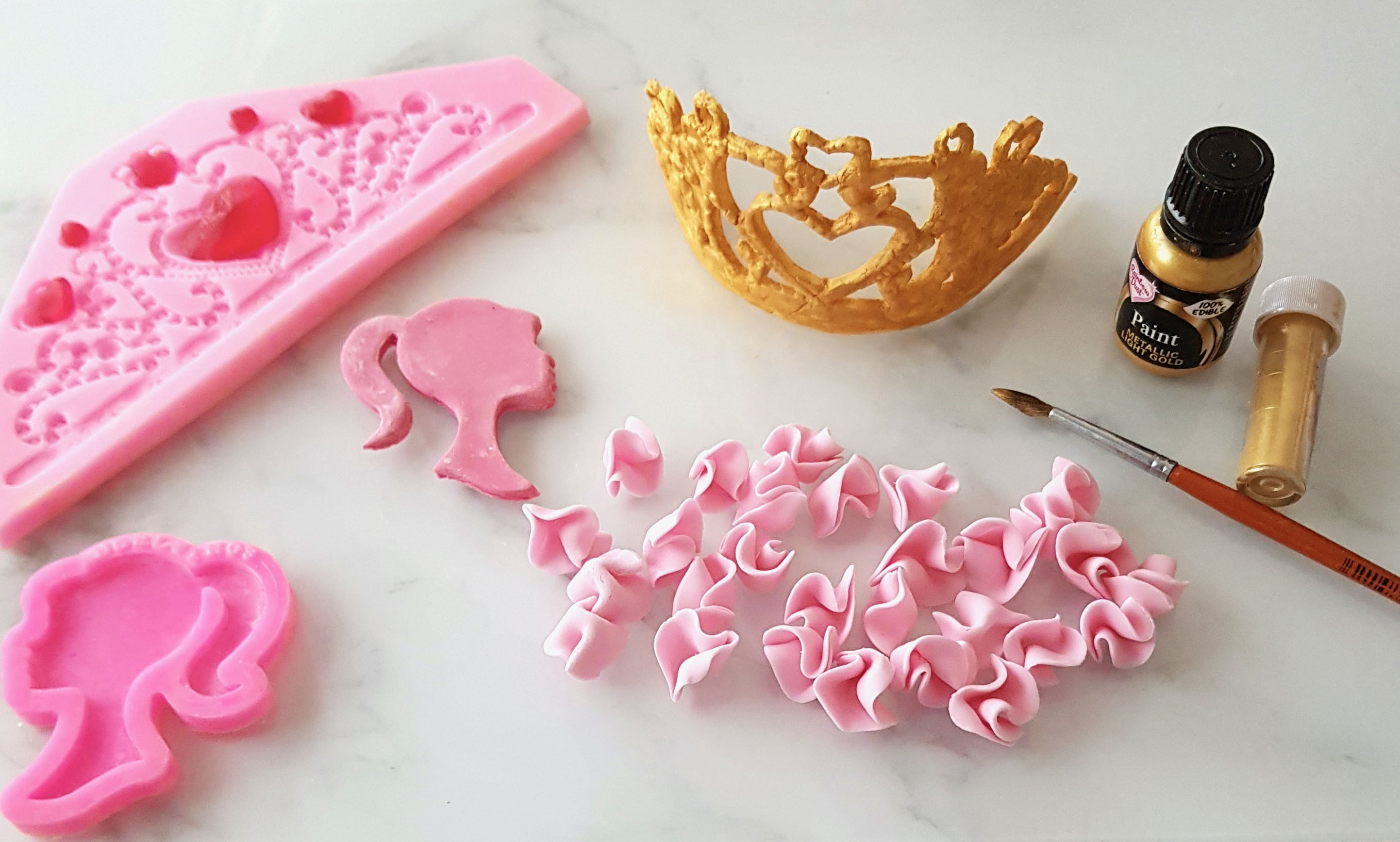 Unos días antes dejé preparados los adornos para que se secasen. Estaban hechos con fondant. Tanto para la silueta de Barbie como para la corona me hice con unos moldes de silicona. Utilicé fondant de color ocre para la corona ya que de esta manera era más fácil teñirla con el colorante oro metalizado en crema. El corazón rosa que aparece en la corona está hecho con azúcar isomalt.