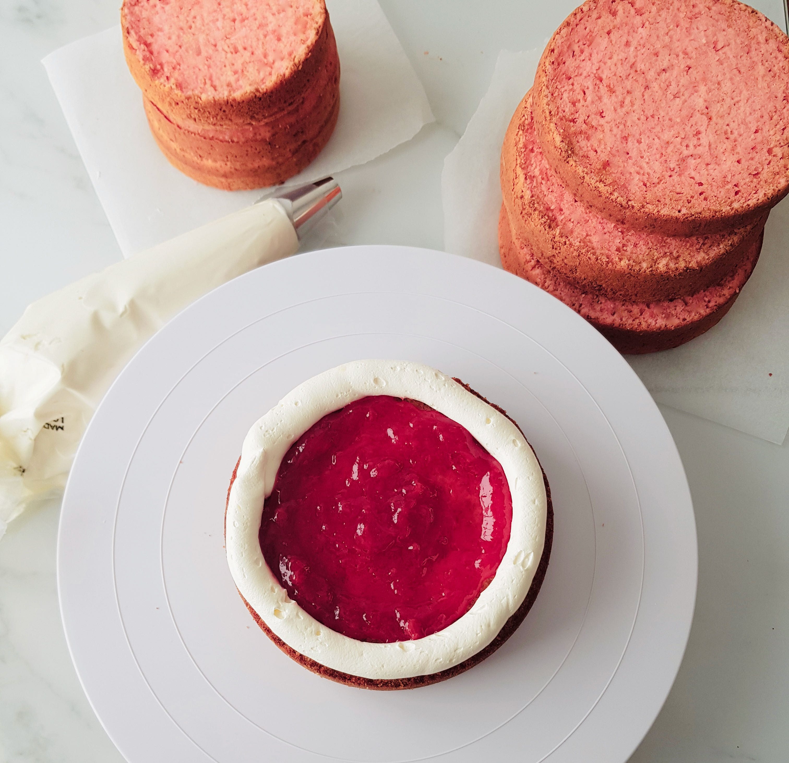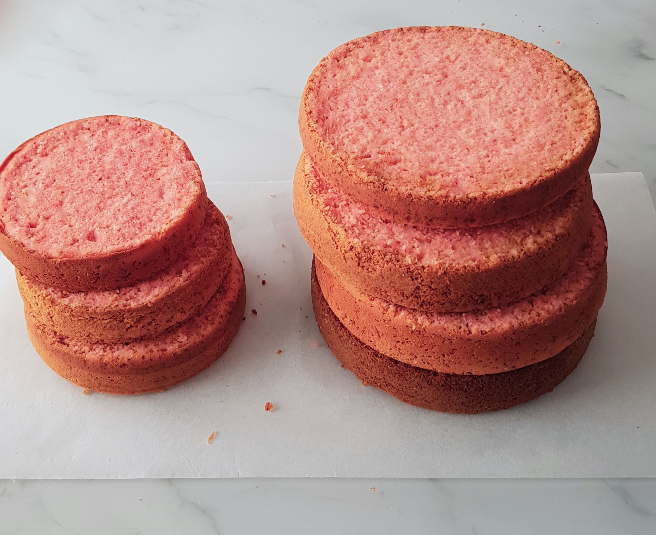 Os cuento como preparé esta tarta. Mirad, estaba compuesta de dos alturas. Para el bizcocho inferior utilicé un molde de 15 x 7 cm de diámetro y para el superior un molde de 12 x 7 cm. Se trataba del clásico Victoria Sponge Cake cuya receta podéis encontrar aquí. Es un bizcocho maravilloso, al que recurro cuando he de preparar tartas de varias alturas o si he de cubrirlas con fondant, ya que es consistente para aguantar peso y a la vez es muy tierno, rico y agradable de comer. Necesité hacer un par de bizcochos de cada molde para obtener 4 capas del molde más grande y 3 del pequeño. En este caso le añadí unas gotas de colorante concentrado en pasta para darle un tono rosado al bizcocho.