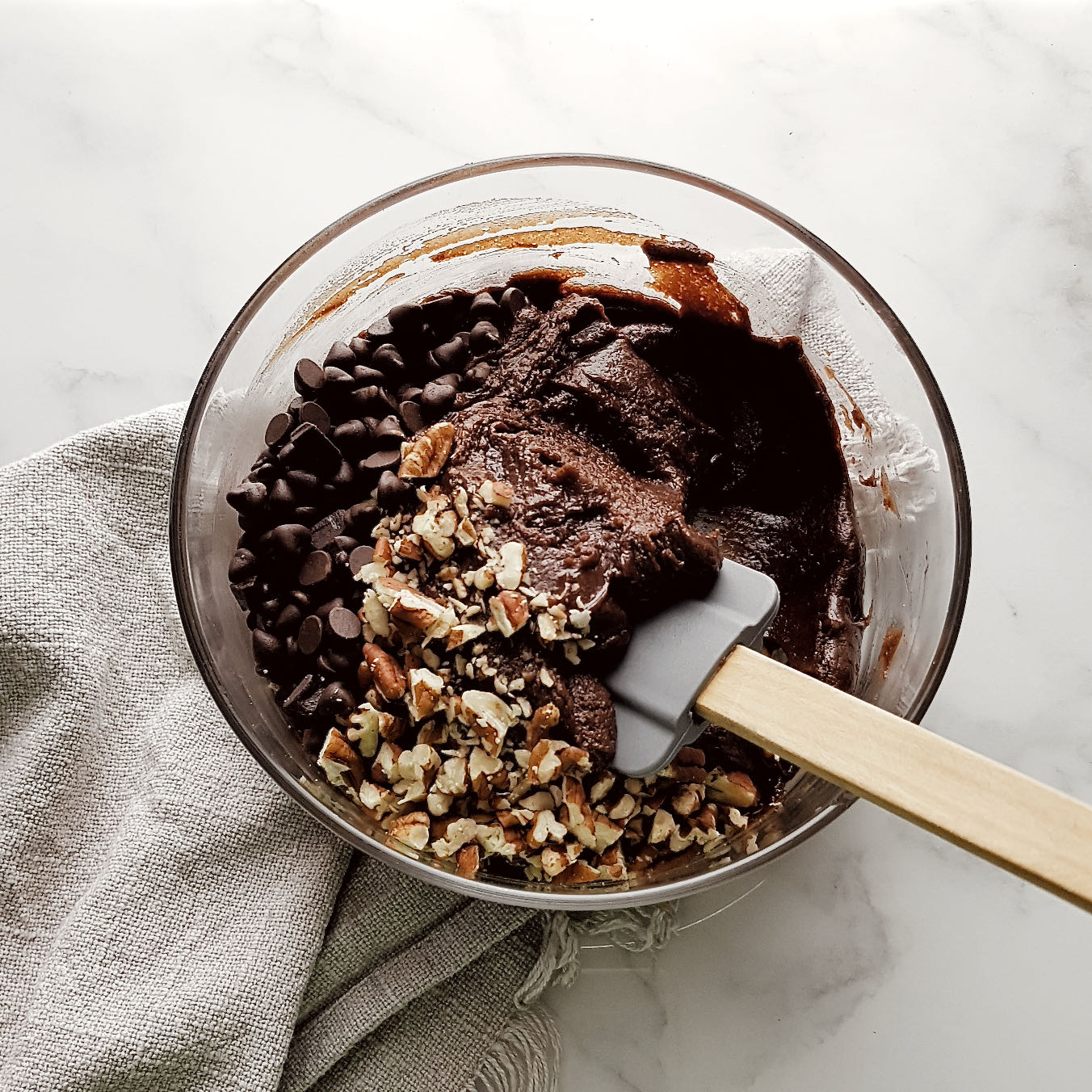Derretimos la mantequilla y la vertemos en un recipiente amplio. Añadimos los dos tipos de azúcar, la vainilla y la yema de huevo y batimos vigorosamente durante 1 minuto hasta que la mezcla se vuelva blanquecina. Añadimos entonces la leche y removemos hasta integrar. Tamizamos los ingredientes secos: la harina, el cacao en polvo, la levadura y la pizca de sal y los agregamos a la mezcla anterior. Mezclamos con una espátula hasta conseguir una mezcla homogénea. Finalmente añadimos las chispas de chocolate y las nueces troceadas y removemos para repartirlas por toda la masa.