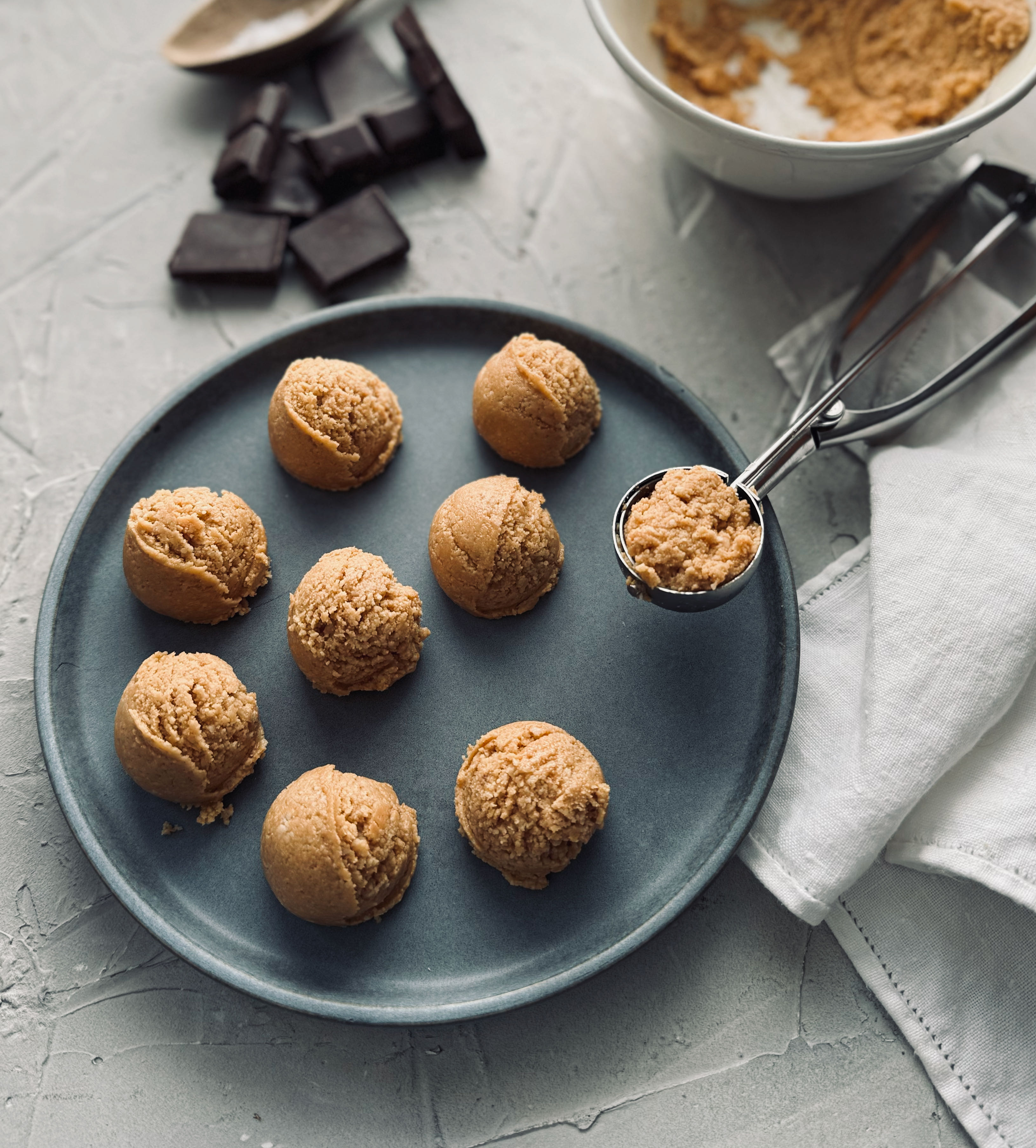 Dividimos la masa en porciones de unos 25 g. Podemos utilizar una cuchara sacabolas de helado para hacerlas todas iguales o pesarlas en una balanza.