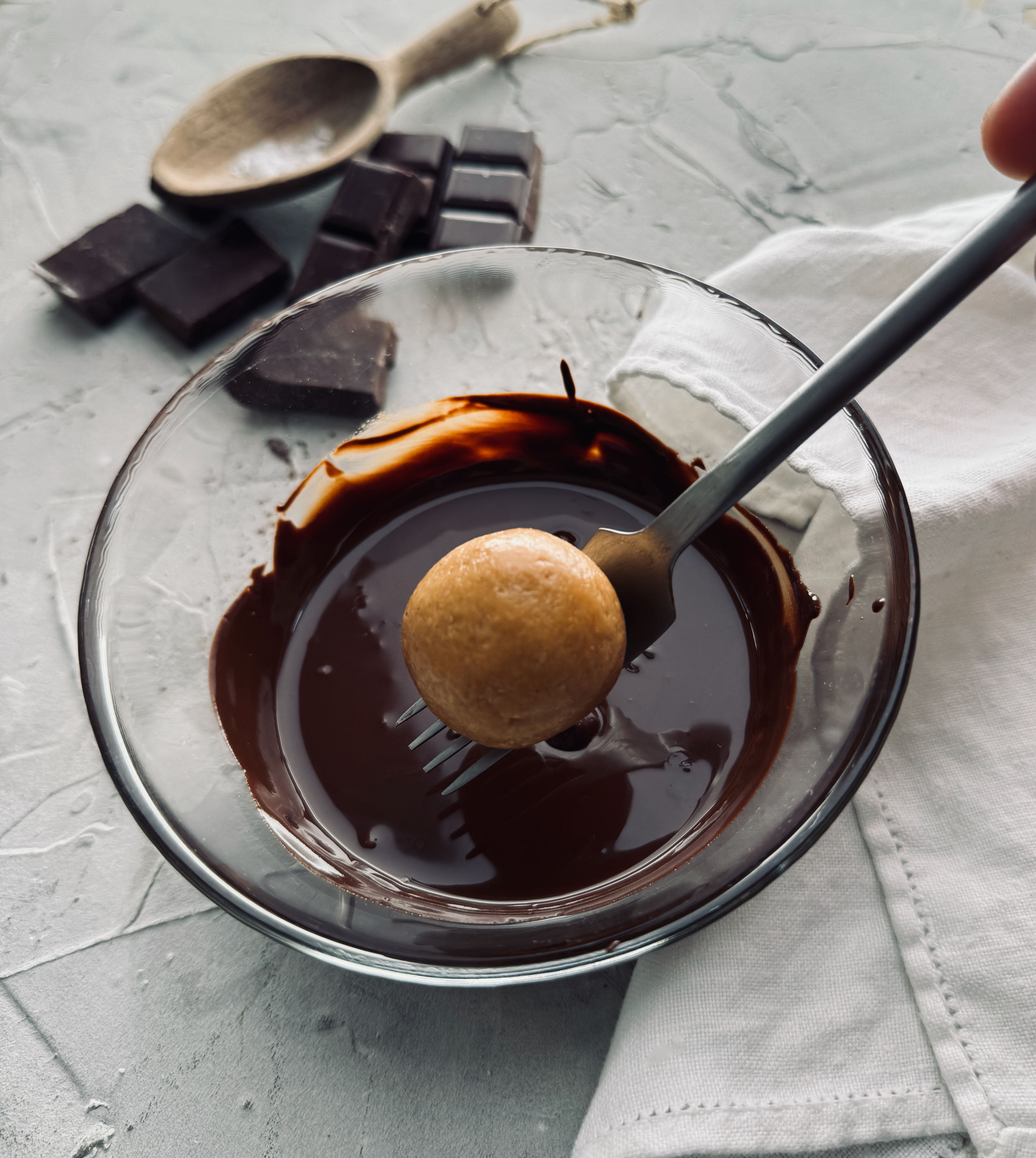 Las bañamos en el chocolate de una en una. Las retiramos con ayuda de un tenedor, dejando que escurra el excedente.