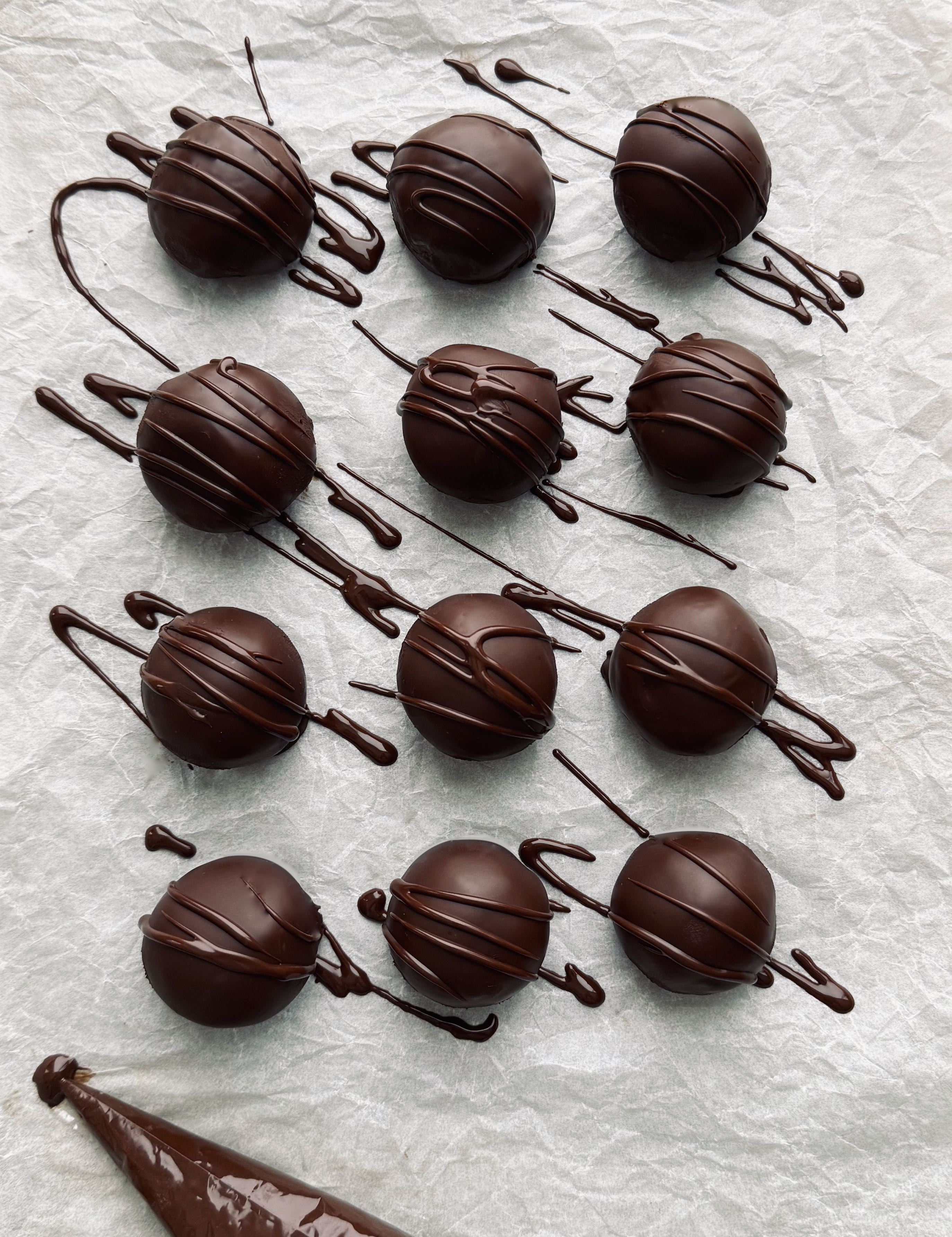 Sacamos la bandeja del frigo, cogemos la manga pastelera y con movimiento rápido trazamos líneas en diagonal sobre las bolas.