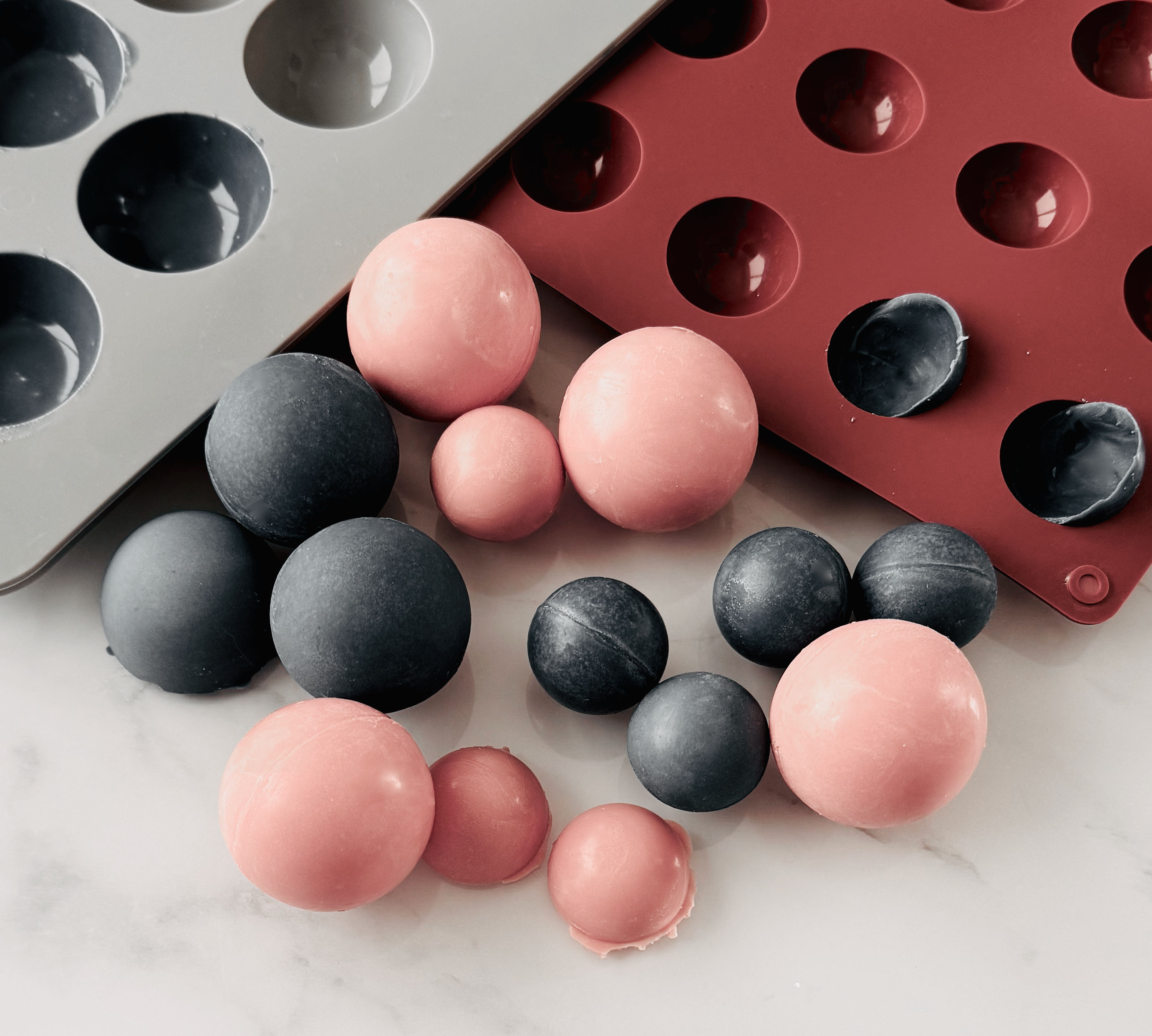 Una vez tenemos el chocolate atemperado, le añadimos el colorante de poco en poco hasta lograr el color deseado y removemos bien para unificarlo. Ya podemos verter en el molde de semiesferas. Haremos de una en una. Rellenamos la cavidad hasta la mitad y vamos girando para cubrirla toda. Volcamos para eliminar el sobrante sobre un plato ya que ese chocolate lo reutilizaremos. Continuamos con todas las que queramos hacer. Es mejor hacer de más, siempre se rompe alguna. Llevamos el molde al frigo a solidificar, retiramos y le damos una segunda capa fina de chocolate. Dejamos endurecer. Sacamos las semiesferas y para unirlas vamos a calentar una sartén antiadherente. Cogemos cada semiesfera con una mano (con guantes para no dejar huellas) Las colocamos boca abajo y con un movimiento rápido las pegamos entre ellas. Y dejamos secar.
