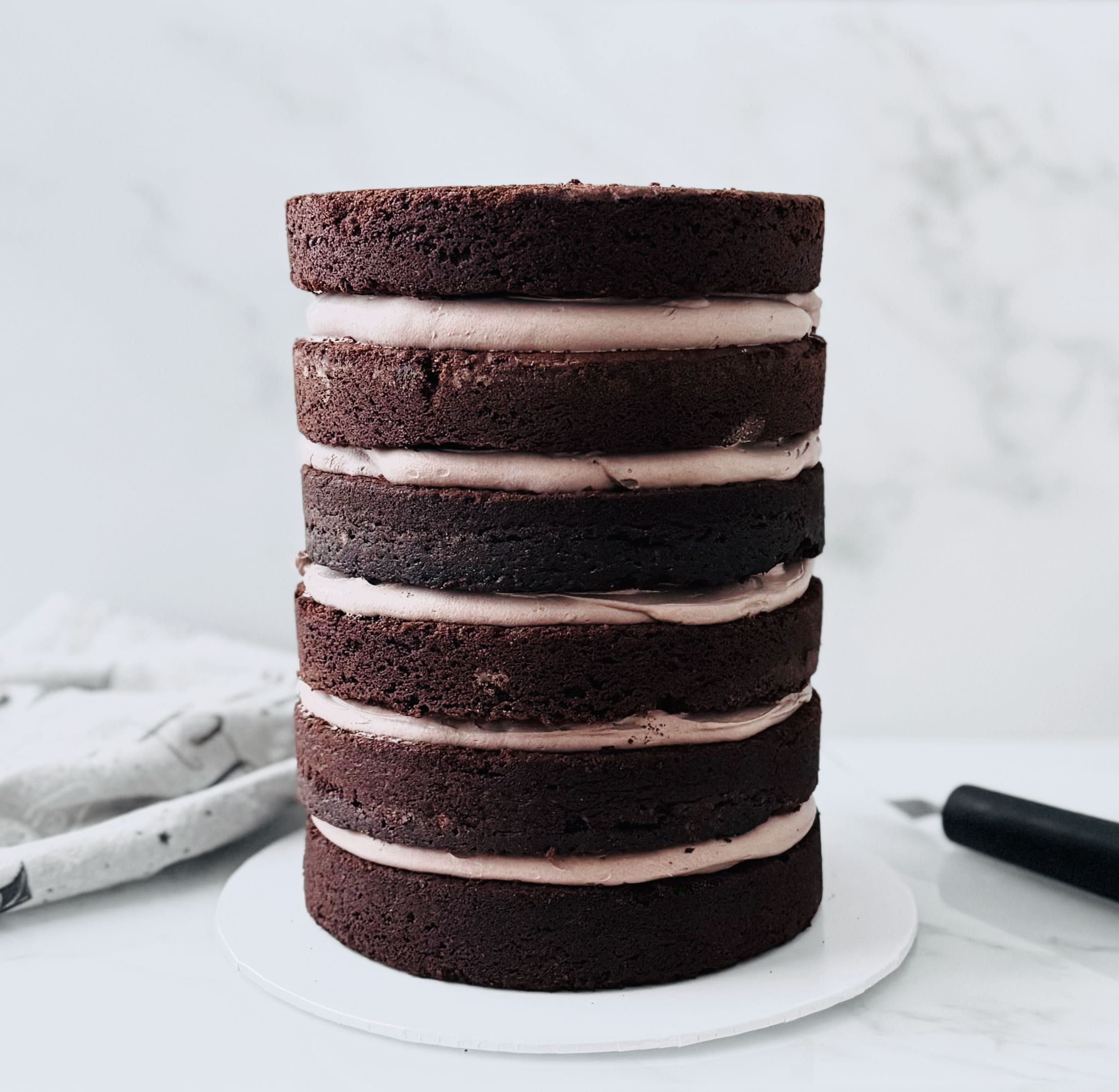 Una vez frío dividimos cada bizcocho en dos discos de 2,5 cm cada uno.