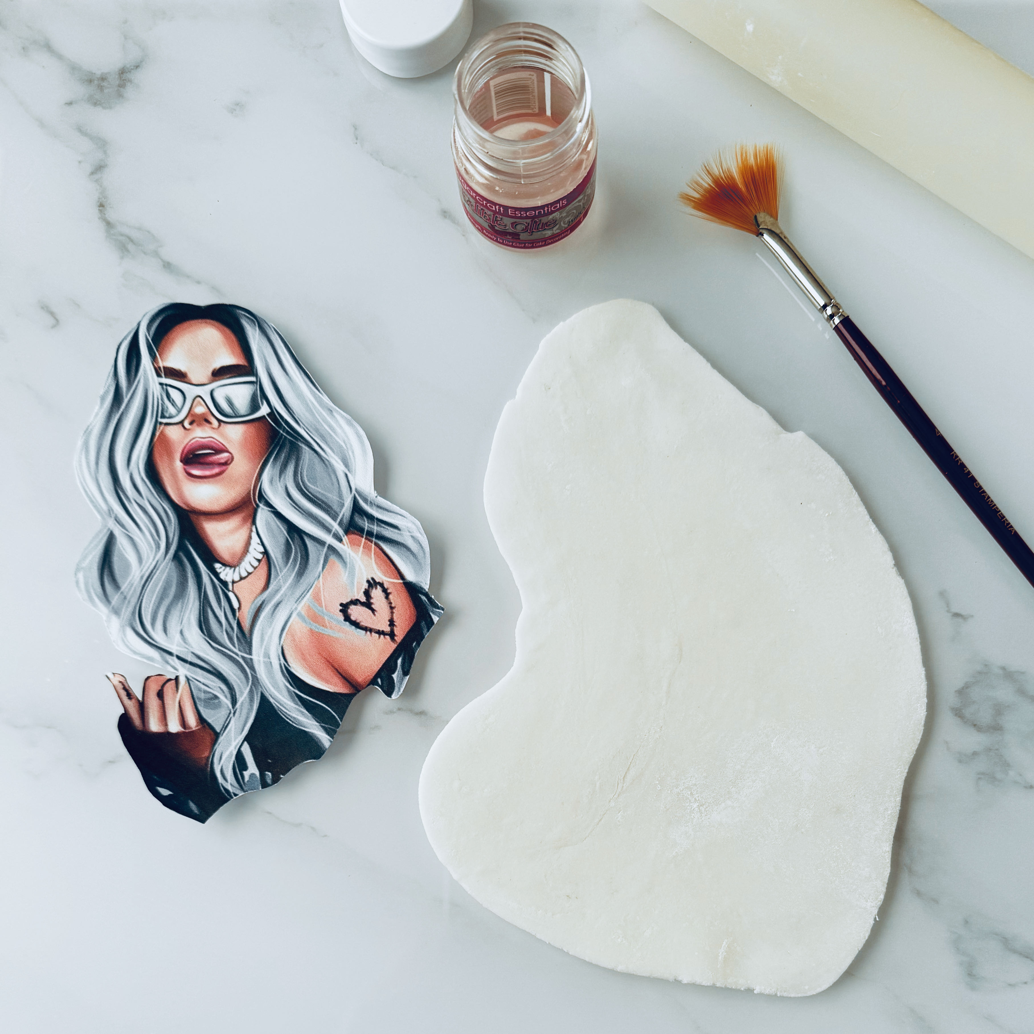 Vamos ahora con las decoraciones. Vamos a utilizar una impresión comestible en papel de azúcar con la imagen del personaje. Se trata de una especie de oblea de sabor avainillado. En este caso la he encargado personalizada a una web de repostería. Si esta impresión la colocásemos directamente sobre la tarta, se humedecería perdiendo la forma. Para evitar eso vamos a estirar muy fino un pedazo de fondant blanco y pegaremos la impresión con un pelín de agua que extenderemos con un pincel.