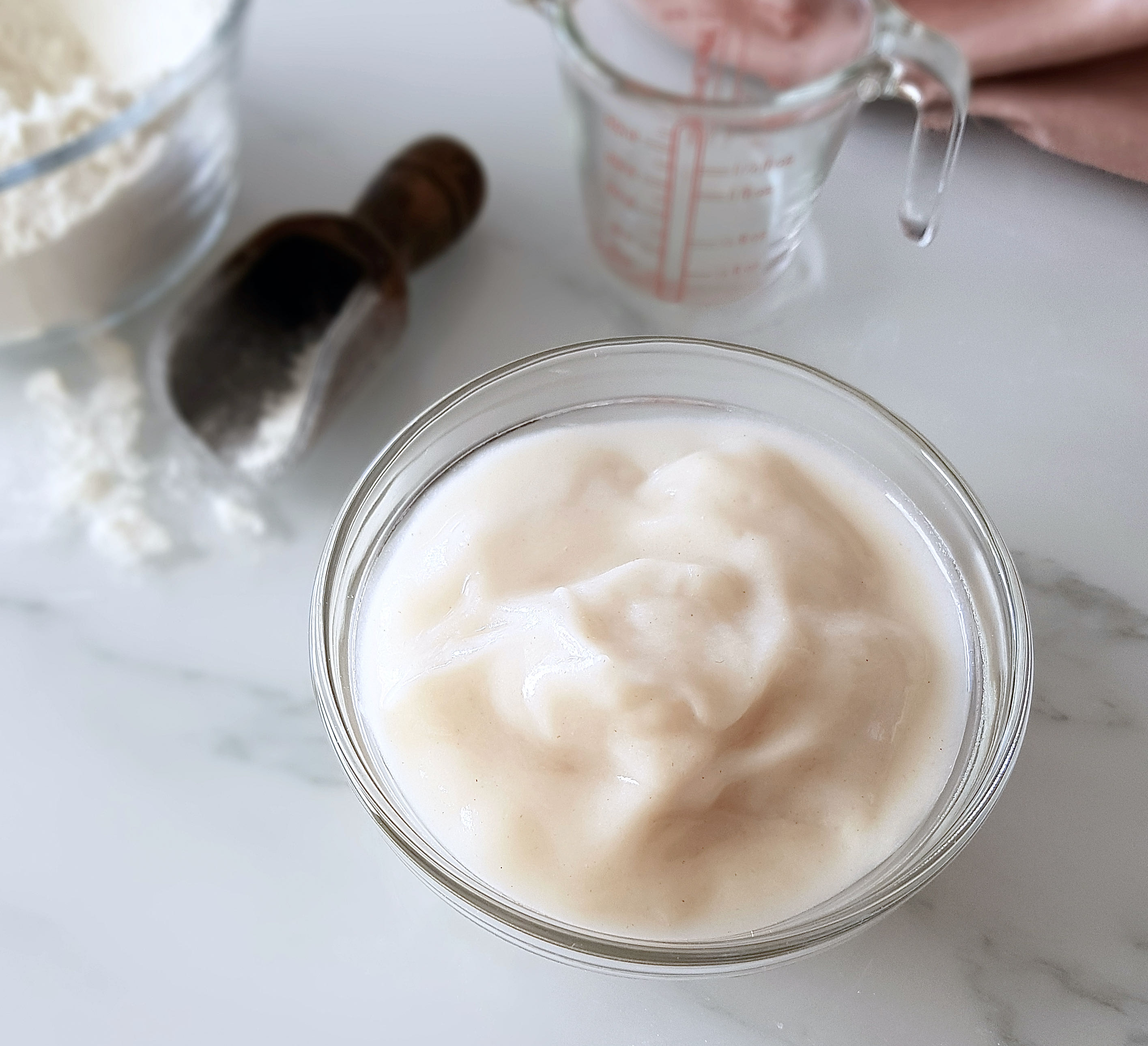 Lo primero que haremos será preparar el Tang Zhong que aportará humedad a la masa. Para ello, en un cazo ponemos la harina tamizada junto con la leche y mezclamos con unas varillas. Cocinamos a fuego lento sin dejar de remover en ningún momento. En cuanto espese retiramos del fuego, lo ponemos en recipiente y cubrimos con film a piel hasta que enfríe, la hemos de utilizar a temperatura ambiente, nunca caliente.