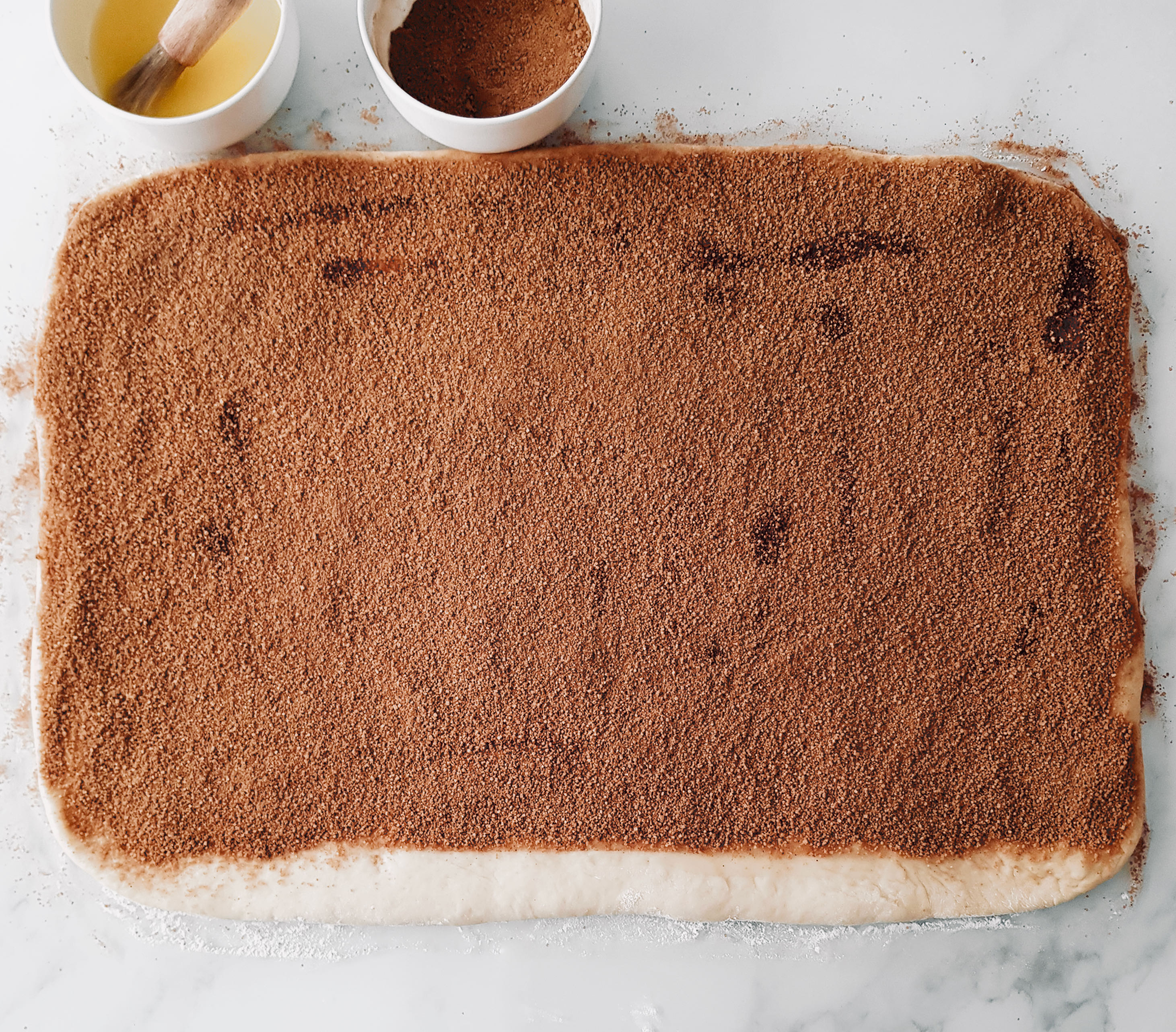 Con ayuda de un pincel, untamos toda la masa con la mantequilla derretida y enfriada, dejando libres un par de centímetros en uno de los lados más largo para poder sellar el rollo (si lleva mantequilla será imposible). Mezclamos el azúcar moreno con la canela y esparcimos sobre la mantequilla. Otra forma de hacer el relleno sería haciendo una pasta con los tres ingredientes y extendiéndolos con una espátula. Como prefiráis, el resultado final es el mismo. Si queremos llevar nuestros bollitos a un nivel superior podemos dorar en un cazo la mantequilla del relleno y enfriarla antes de extenderla en la masa junto con la canela y el azúcar moreno.