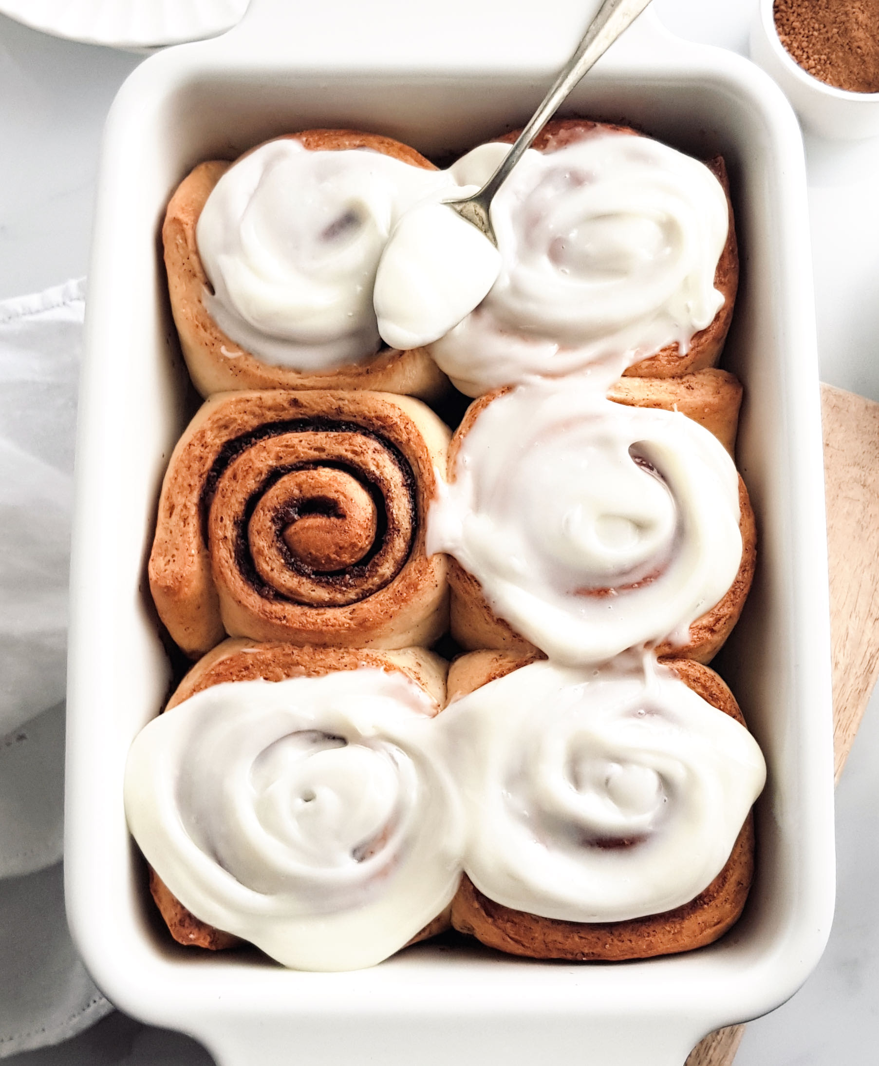 Al ser unos bollitos no muy dulces, la guinda del pastel se la vamos a poner con el glaseado de queso crema. Tenemos dos opciones: o bien se lo agregamos justo al salir del horno cuando aún están calientes, con lo cual el glaseado se volverá más líquido empapando los rollos y resultando aún más jugosos. O los dejamos entibiar y extendemos una cucharada de glaseado por encima. Aunque también podemos tomarlos sin y, en ese caso, recomiendo añadir un poco más de dulzor a la masa para que no resulten insípidos.