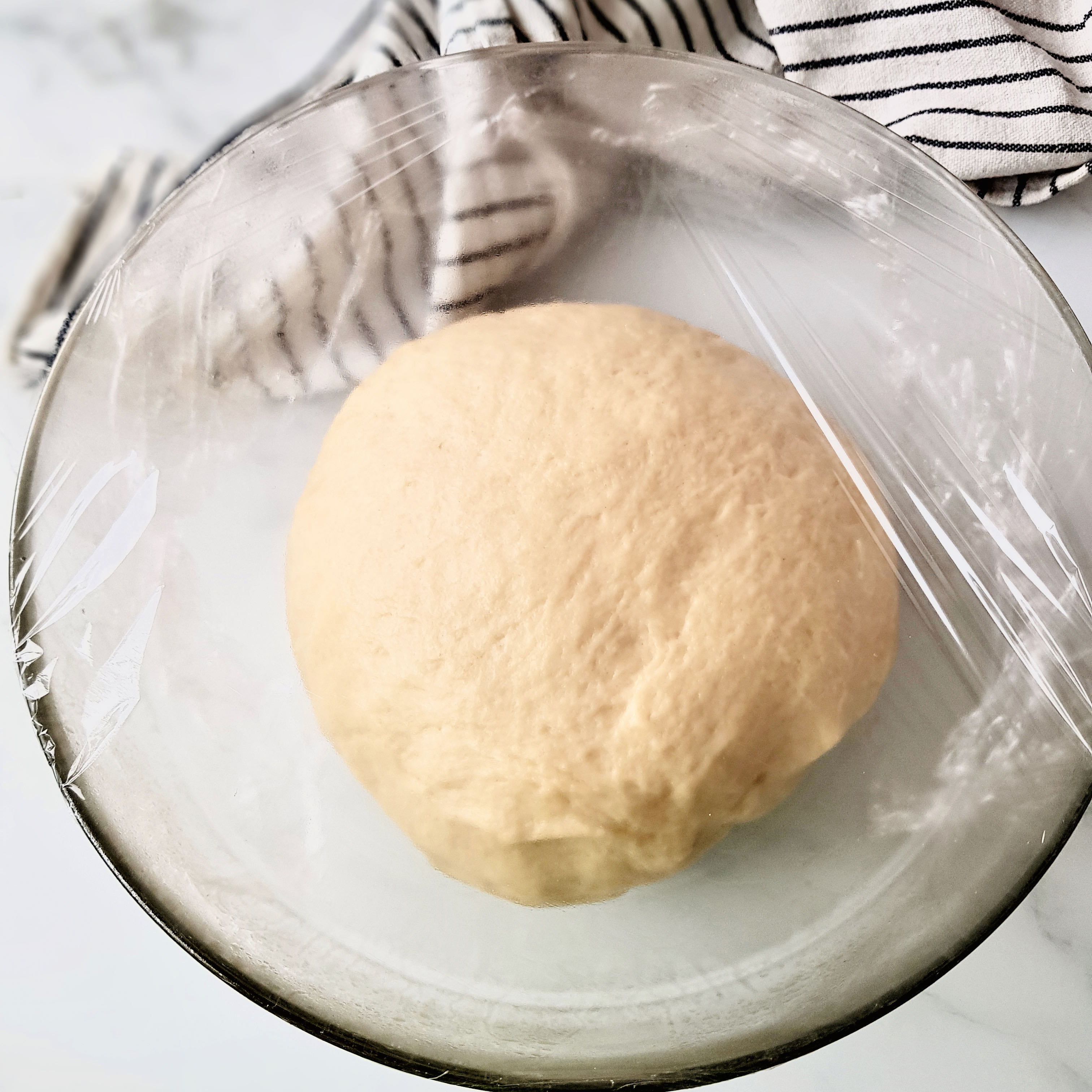Bien, pues una vez que ya tenemos la masa lista la ponemos en un cuenco amplio ligeramente enceitado y tapamos con film transparente.