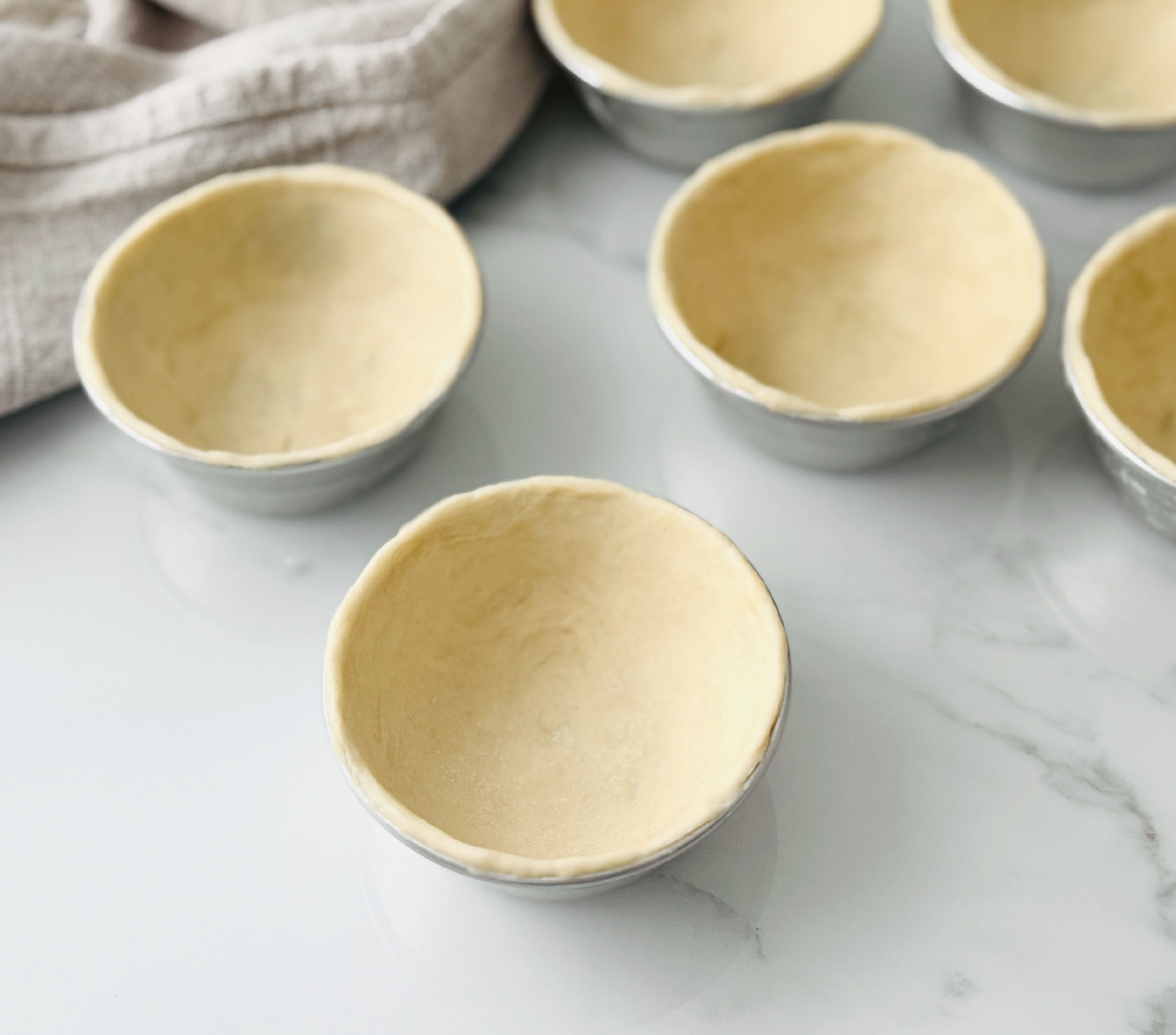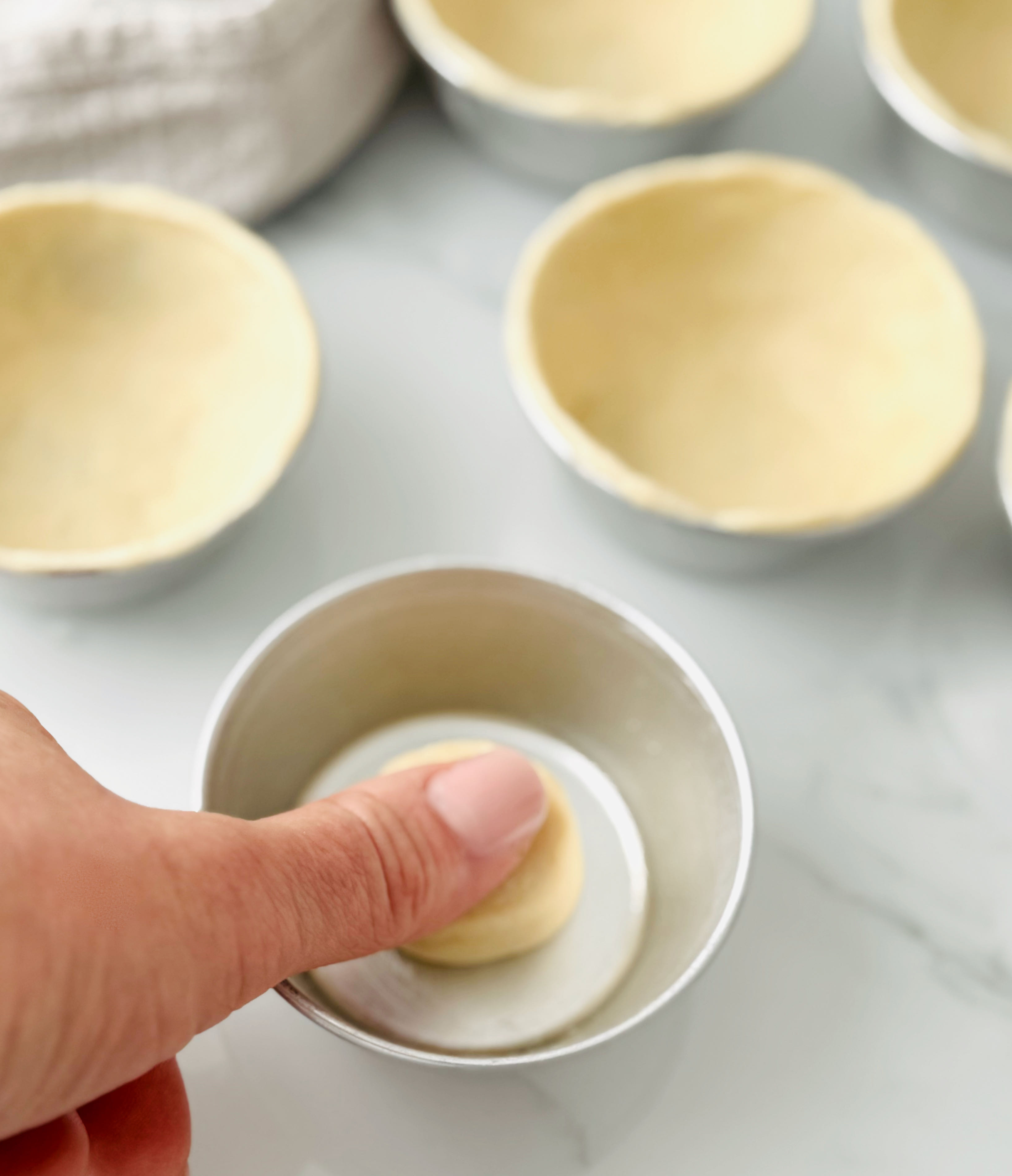 Al principio puede que no nos quede todo lo bien que queremos pero cuando llevéis unos cuantos le cogeréis el punto. Lo importante es que dejemos la masa muy fina, de unos 2-3 mm y sobretodo procurar que no se abran agujeros. Si fuera ese el caso, le pegaríamos un parche de hojaldre con un pelín de agua. Es importante no tocar el borde, trabajar desde abajo y con los pulgares arrastrando y forrando las paredes. Si el borde superior queda muy gordo porque nos sobra masa podemos recortarlo con el cuchillo.